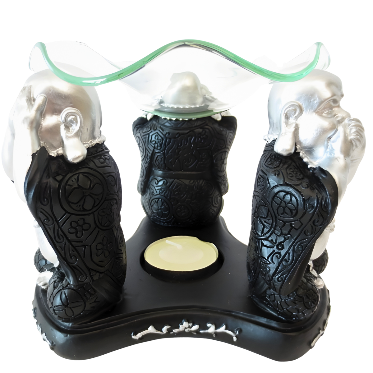 Dekorativer Ölbrenner aus Kunstharz mit drei fröhlichen Buddhas in der klassischen Pose „nichts hören, nichts sehen, nichts sagen“.