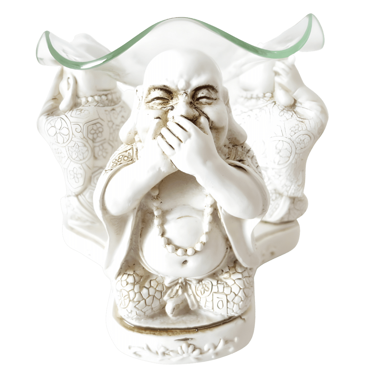 Weißer Duftölbrenner aus Kunstharz mit drei fröhlichen Buddha-Figuren in