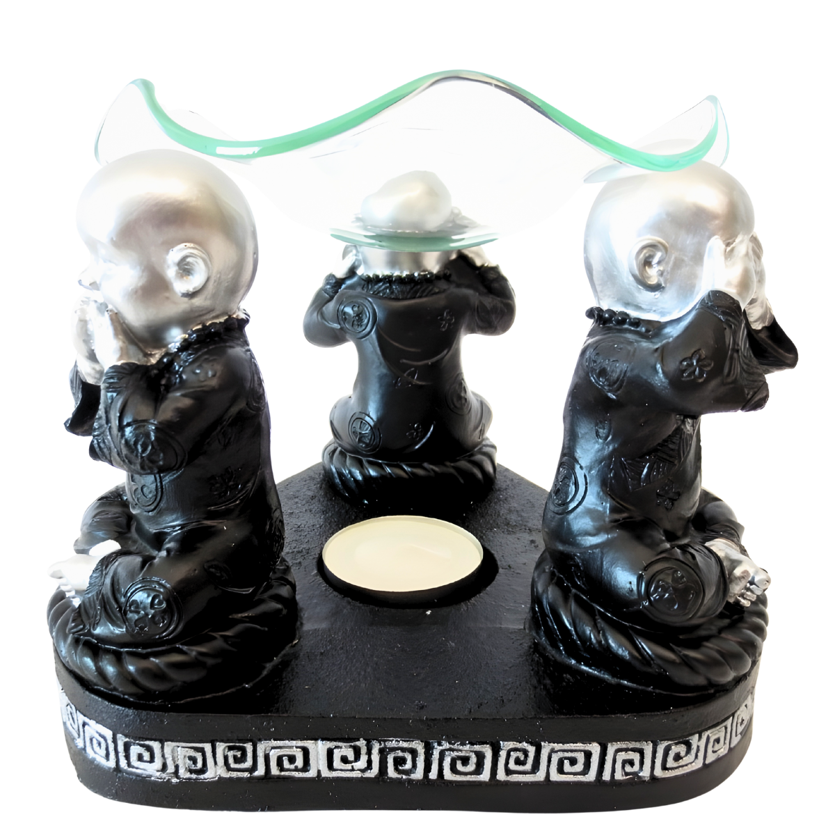 Enthalten: Ölbrenner aus Kunstharz mit drei Mönchsfiguren, abnehmbare Glasschale für Duftöl