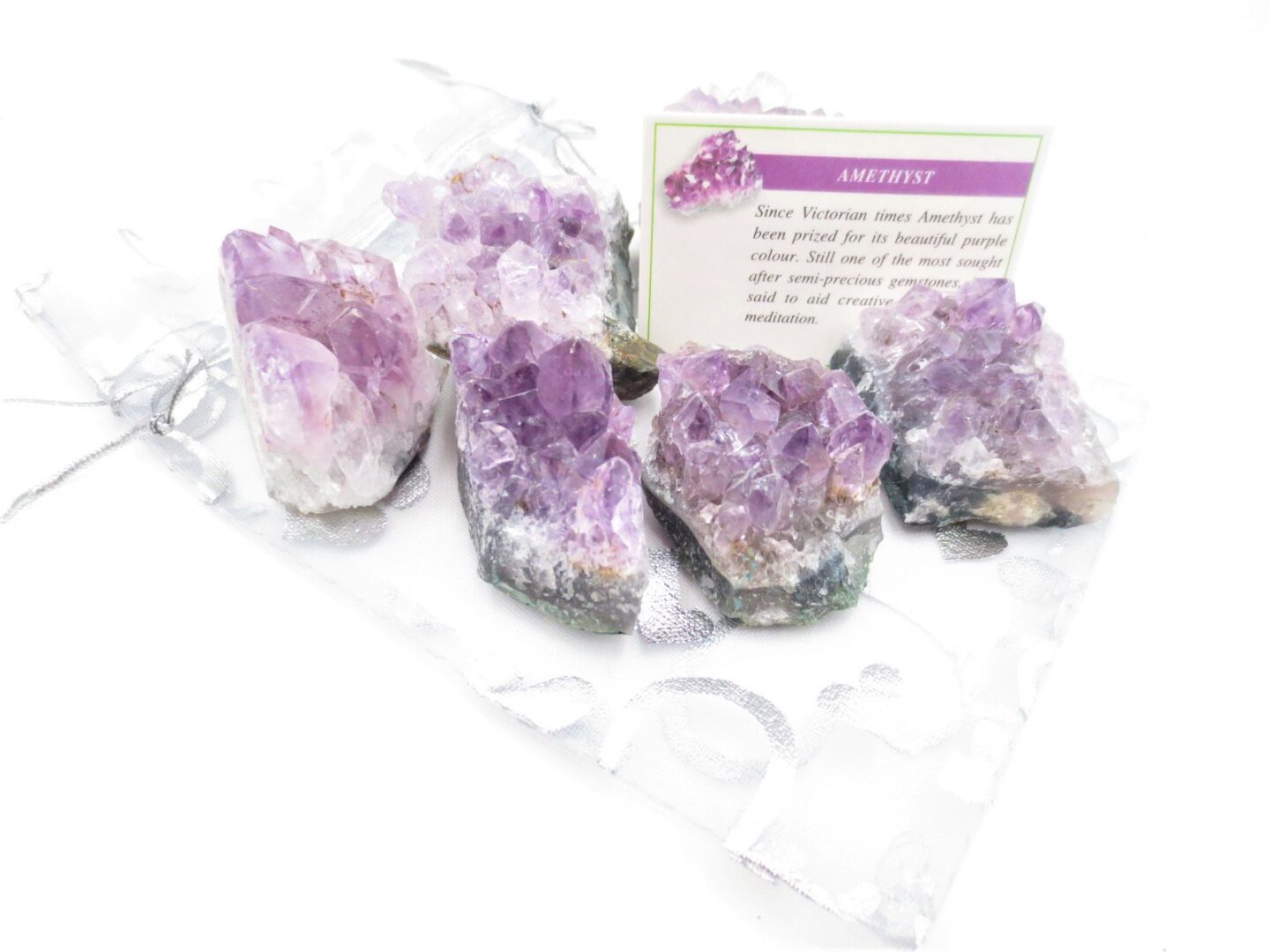 6 Amethyst Cluster Steine in einem Organzabeutel verpackt. Kommt mit einer Karte mit Informationen und Bedienung des Edelsteins zusammenEdelsteingröße: 3-4cmMindestabnahme beträgt 1 Beutel = 6 Steine
