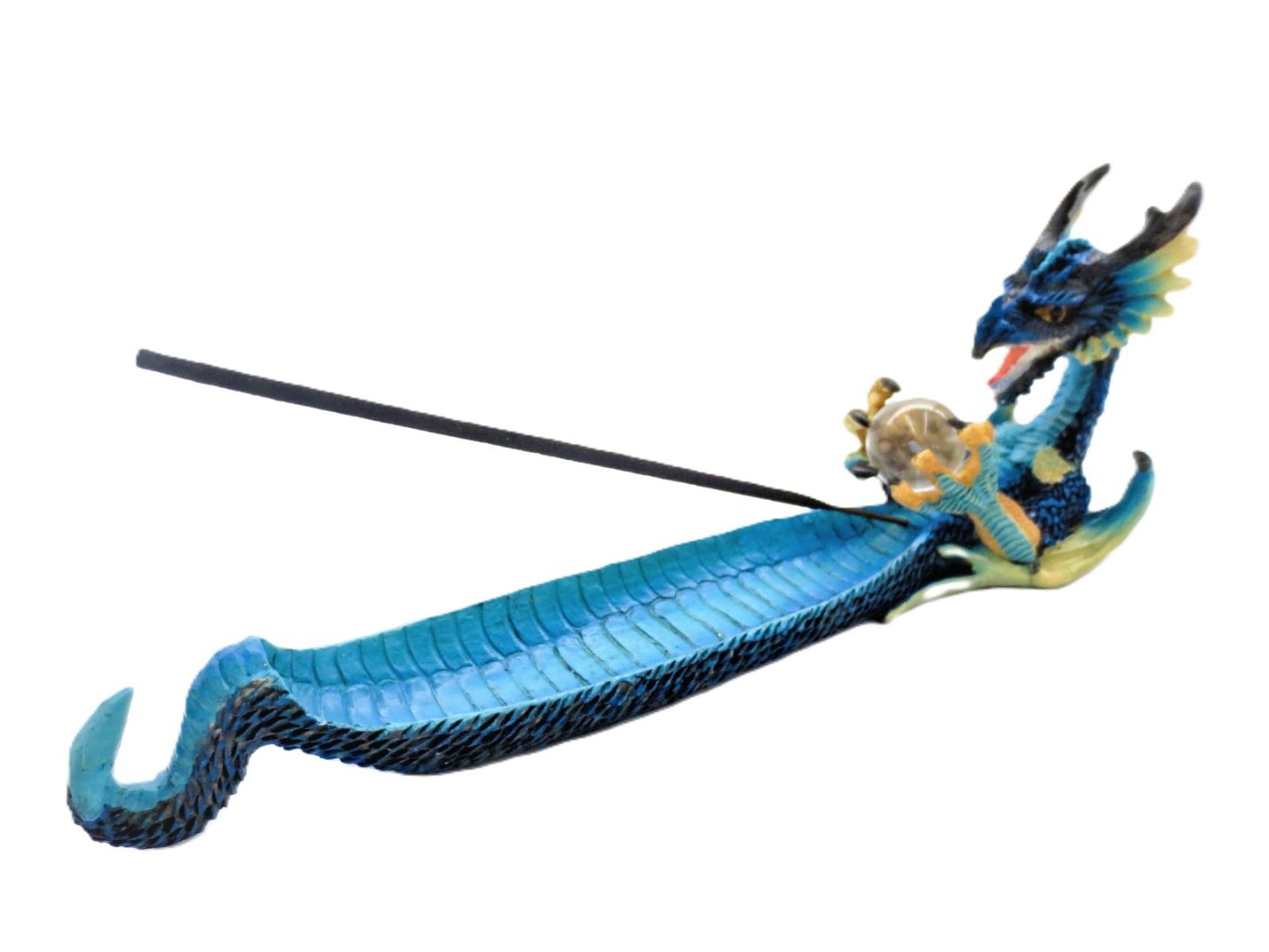 Bleu Fantasy Drachen Räucherstäbchenhalter. Der Drache liegt und hat einen Kristall ball in seiner Pfote. Der Halter ist aus Poly-Stein gemacht.