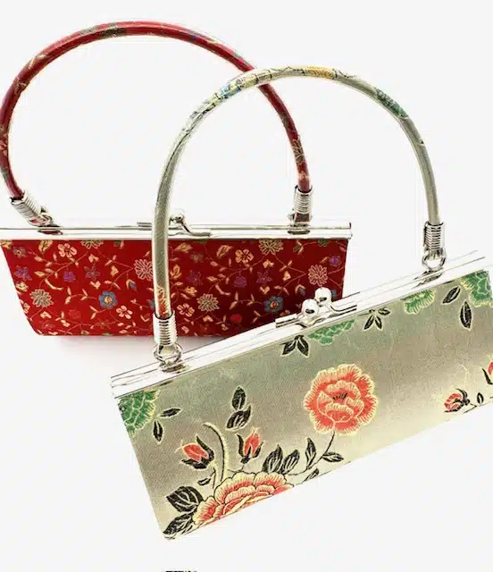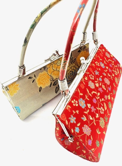 Diese elegante Clutch-Handtasche ist aus hochwertigem, reich gemustertem Brokadestoff gefertigt und mit einem stabilen Metallrahmen sowie einem klassischen Bügelverschluss (Kiss-Lock) versehen. Inspiriert vom traditionellen asiatischen Textildesign vereint sie dekorative Schönheit mit praktischer Funktionalität.