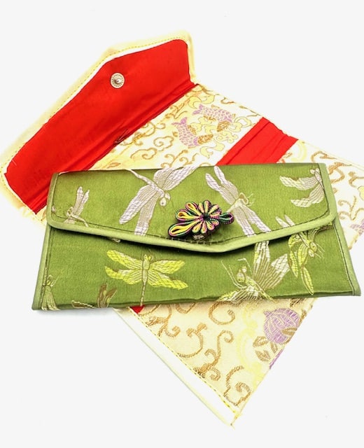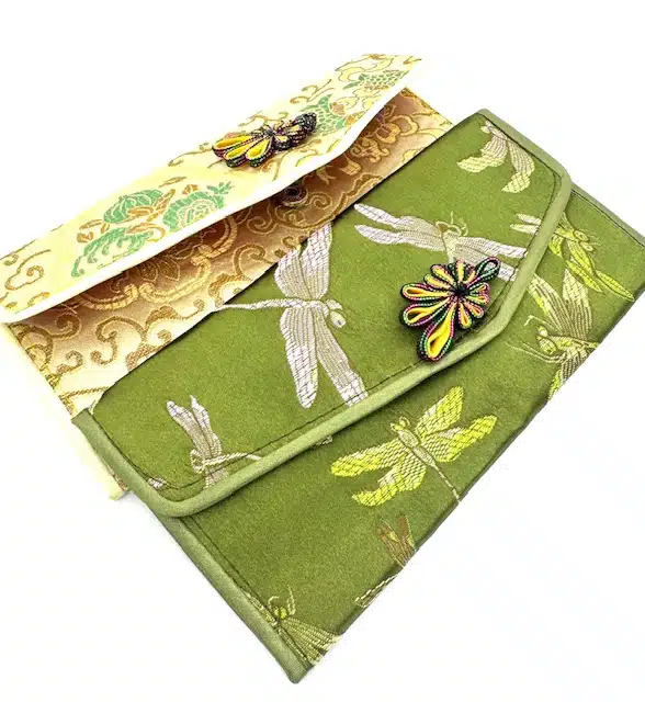 Diese elegante Brokadentasche besticht durch ein traditionelles Libellenmotiv und ein weiches Stofffutter. Sie ist mit einem sicheren Druckknopfverschluss versehen und im asiatischen Textilstil handgefertigt – eine gelungene Kombination aus Ästhetik und Alltagstauglichkeit.