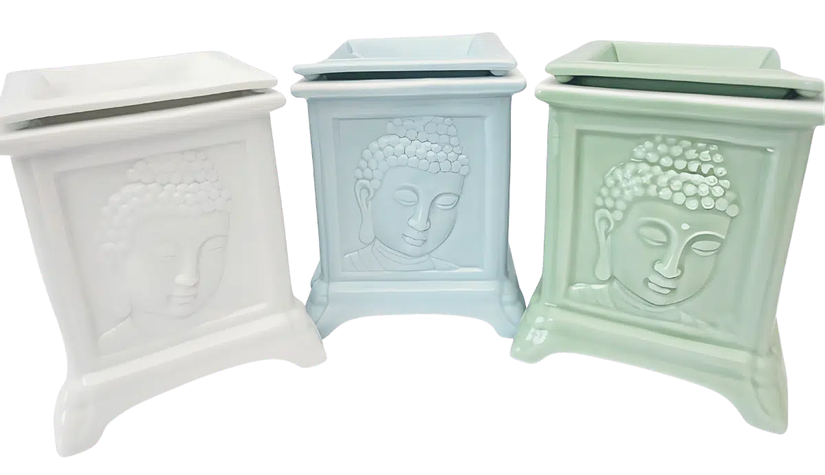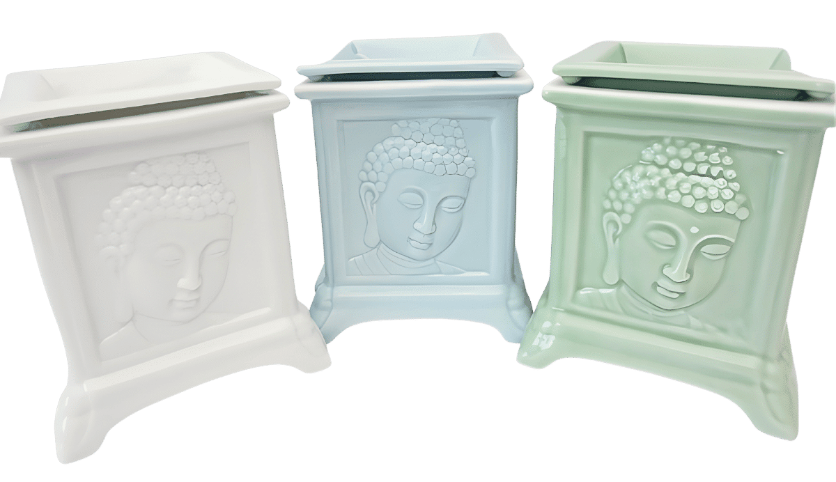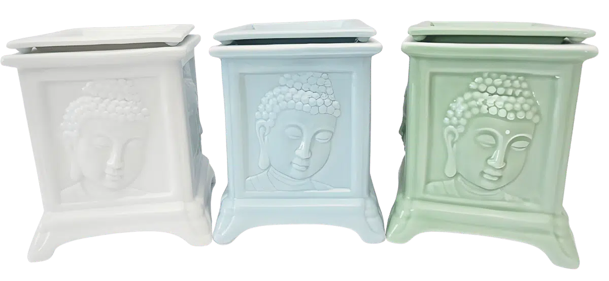 Hochwertiges Buddha-Duftlampen-Set aus glasiertem Keramik. Jede Lampe zeigt ein ruhiges Buddha-Relief auf der Frontseite und ist in einer anderen Pastellfarbe gehalten: Jade, Hellblau und Weiß. Die abnehmbare Schale oben eignet sich für Duftöle oder Wachs-Melts, während im inneren Bereich ein Teelicht platziert wird, das die Schale sanft erwärmt.