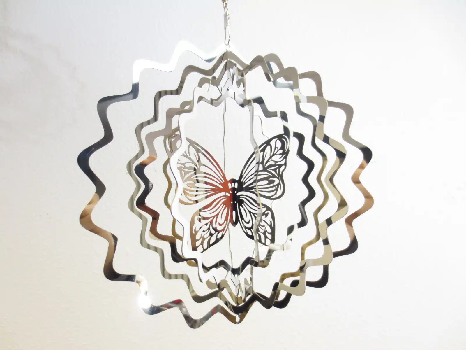 In der Mitte befindet sich ein kunstvoll ausgeschnittener Schmetterling mit wunderschönen Kupfer/Rot-Tönen, umgeben von mehreren geschichteten Wellenringen die sich unabhängig voneinander im Wind drehen. Die spiegelpolierte Oberfläche reflektiert das Sonnenlicht in alle Richtungen — und wirft blendende Lichtmuster rund um Ihren Garten, Ihre Terrasse oder Ihren Balkon. Hängen Sie es einfach an der mitgelieferten Kette auf und lassen Sie den Wind den Rest erledigen.
