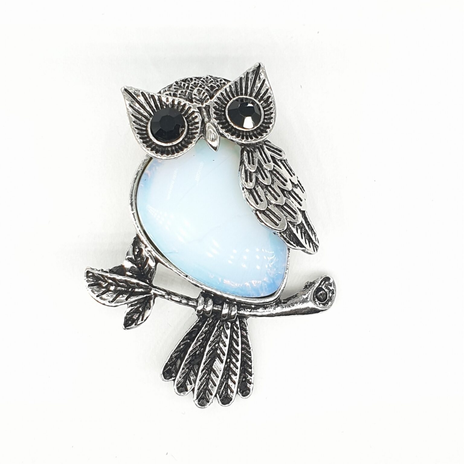 Das filigrane Eulendesign besticht durch wunderschöne Federdetails und einen glatten opalstein als Körper, der das Licht in einem bezaubernden, schimmernden Glanz einfängt. Ihre großen Augen sind mit auffälligen schwarzen Edelsteinen besetzt, die einen kräftigen Kontrast zur sanften, ätherischen Farbe des Opal bilden.