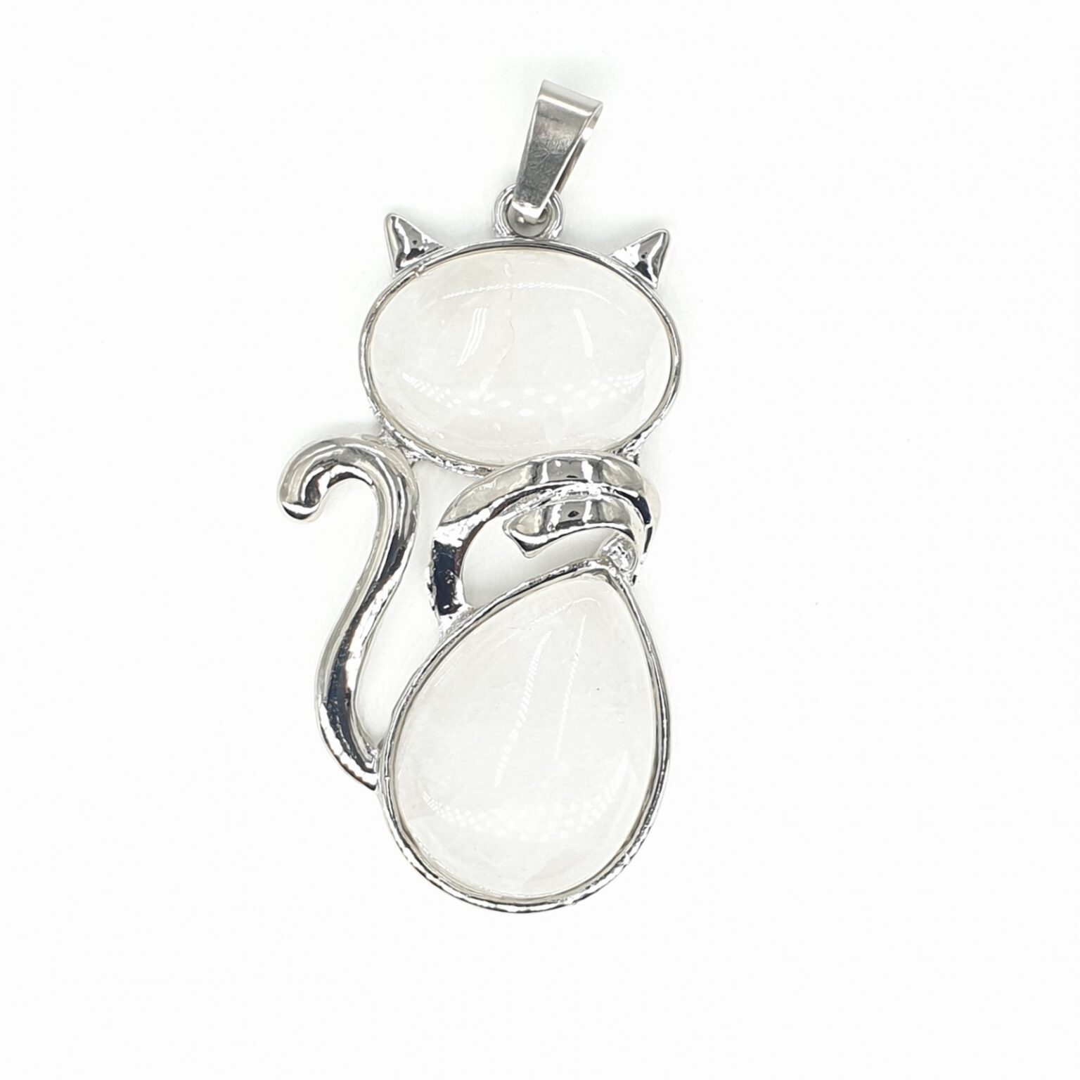 Dieser einzigartige Anhänger ist mit einem eleganten, silberfarbenen Setting gefertigt und zeigt zwei polierte Bergkristall-Edelsteine, die den Kopf und den Körper der Katze bilden. Die glatten, glänzenden Steine weisen wunderschöne natürliche Farben auf, die den Anhänger aus jedem Blickwinkel zum Blickfang machen.