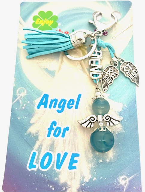 Großhandel – Türkis „FRIEND“ Engel Edelstein-Schlüsselanhänger mit Quaste, Kleeblatt und Lebensbaum-Anhänger