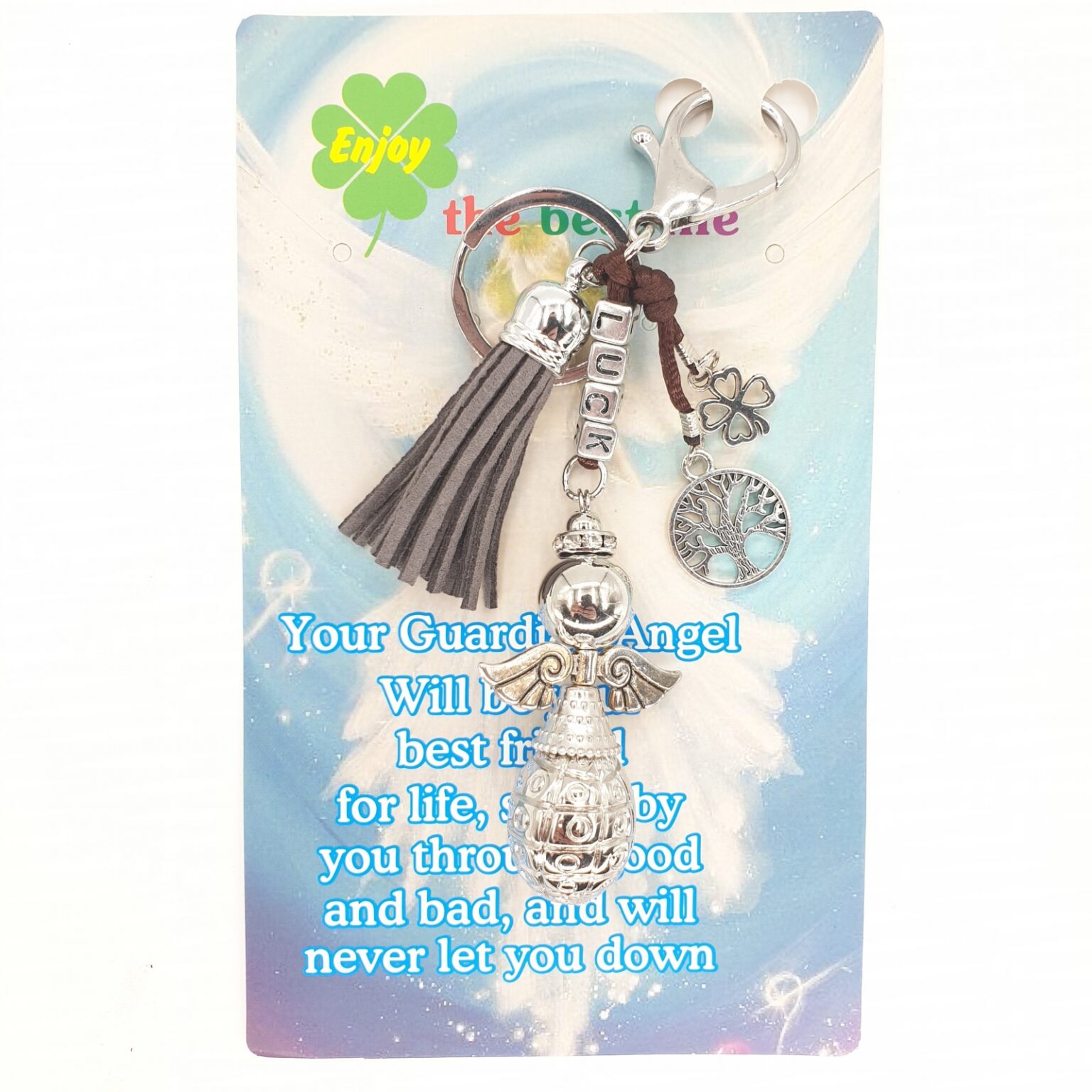 Großhandel – Grauer “LUCK” Angel Schlüsselanhänger mit Quaste, Kleeblatt und Lebensbaum Anhänger