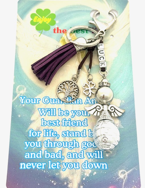 Großhandel – Lila “LUCK” Angel Schlüsselanhänger mit Quaste, Kleeblatt und Lebensbaum Anhänger