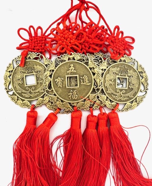 Feng Shui Wandbehang mit Chinesischen Münzen und roten Quasten, 6er-Set