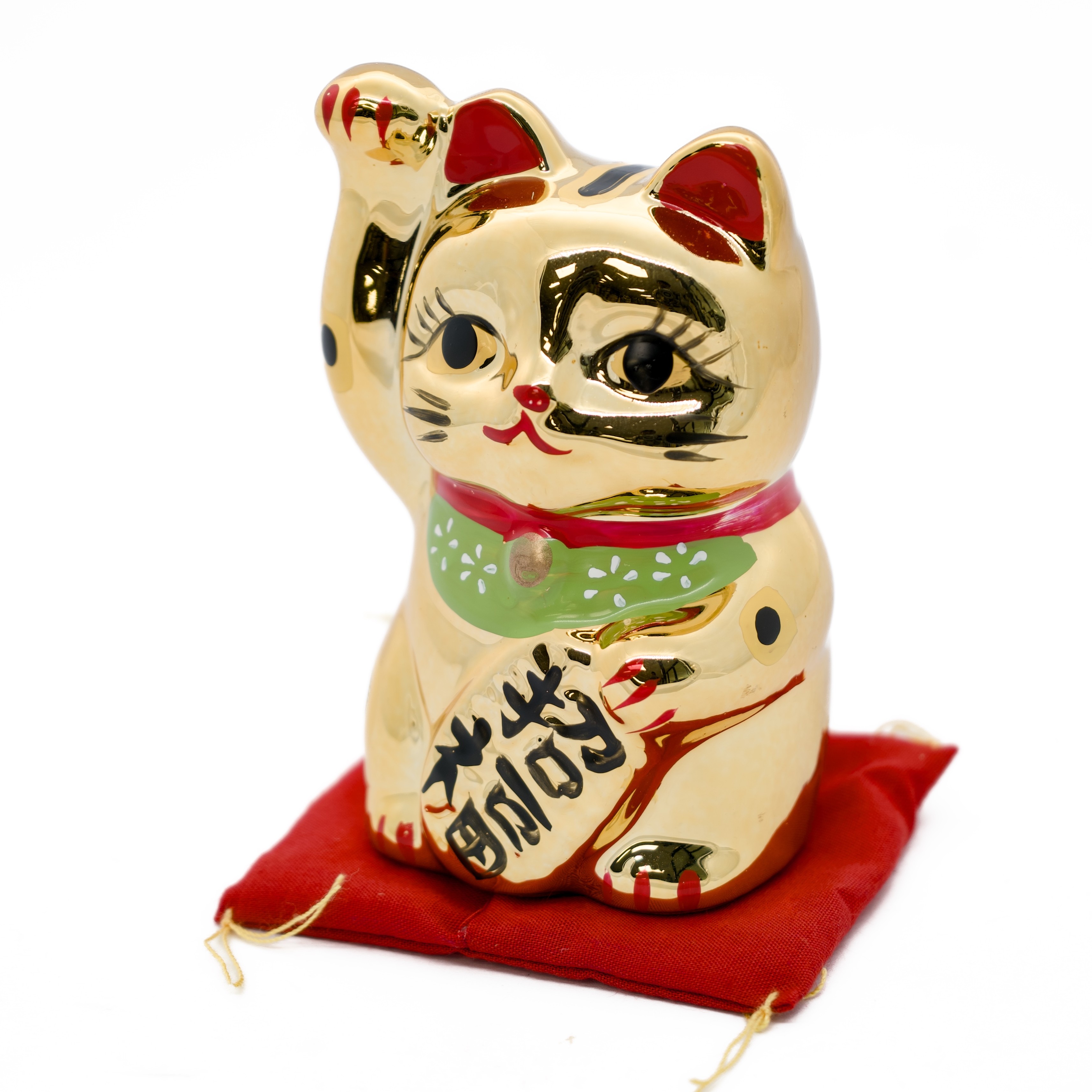 Diese elegante Katze hat eine Pfote erhoben und hält eine goldene Koban-Münze mit den Zeichen 招財 (“Reichtum anziehen”) fest. Die großen ausdrucksstarken Augen mit langen Wimpern verleihen ihr einen einzigartigen weiblichen Charakter. Ein elegantes blaues Halsband mit weißen Blumenmotiven schmückt ihren Hals. Der Hochglanz gold-metallische Körper strahlt Luxus und Wohlstand aus. Die Spardose wird auf einem roten Samtkissen mit goldenen Schnüren geliefert — fertig zum Verschenken.