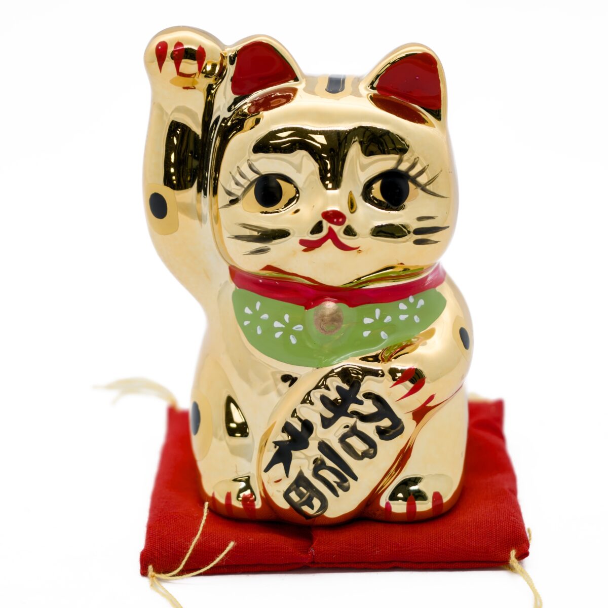 Diese elegante Katze hat eine Pfote erhoben und hält eine goldene Koban-Münze mit den Zeichen 招財 (“Reichtum anziehen”) fest. Die großen ausdrucksstarken Augen mit langen Wimpern verleihen ihr einen einzigartigen weiblichen Charakter. Ein elegantes blaues Halsband mit weißen Blumenmotiven schmückt ihren Hals. Der Hochglanz gold-metallische Körper strahlt Luxus und Wohlstand aus. Die Spardose wird auf einem roten Samtkissen mit goldenen Schnüren geliefert — fertig zum Verschenken.