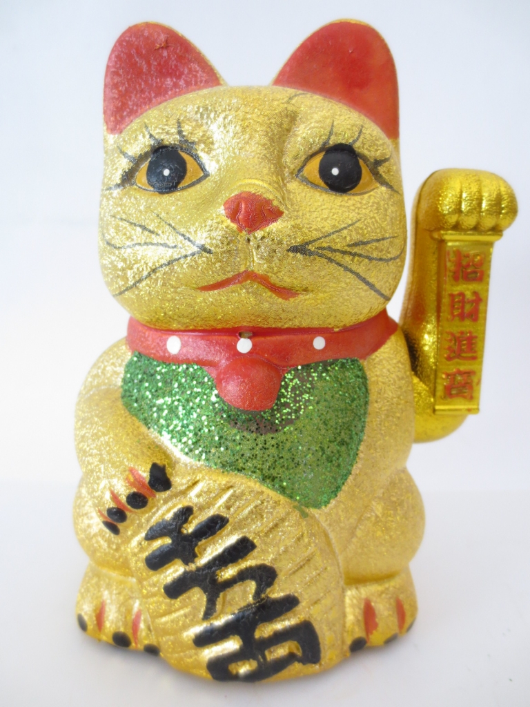 Laden Sie Wohlstand in Ihr Zuhause ein mit dieser goldenen Maneki-Neko-Figur. Hergestellt aus Kunstharz und mit einem glitzernden grünen Lätzchen und einem roten Halsband, hält diese winkende Katze eine Münze und ein goldenes Banner mit chinesischen Schriftzeichen, die „Reichtum anziehen“ bedeuten. Ideal für Zuhause, Büro, Restaurant oder Ladeneingänge.