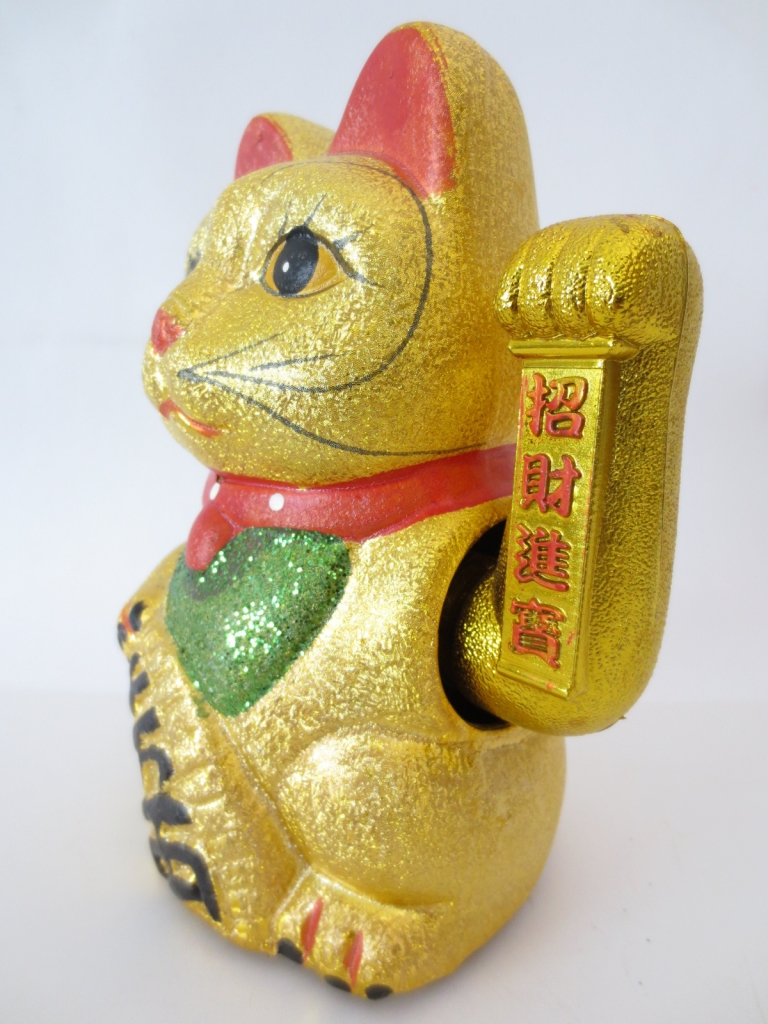 Großhandel – Glücksbringer-Glitzerkatze Gold mit beweglichem Arm (Mittel)