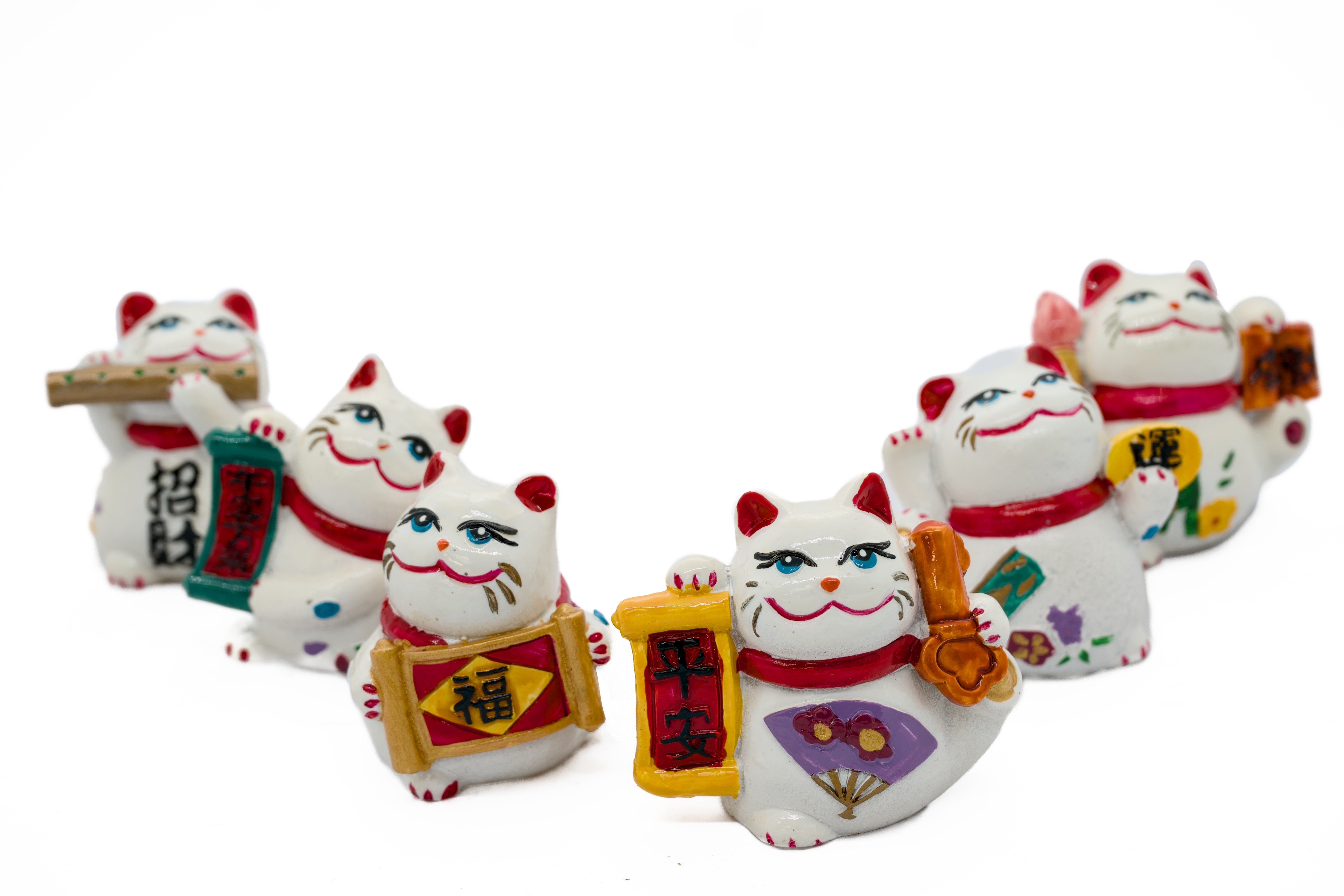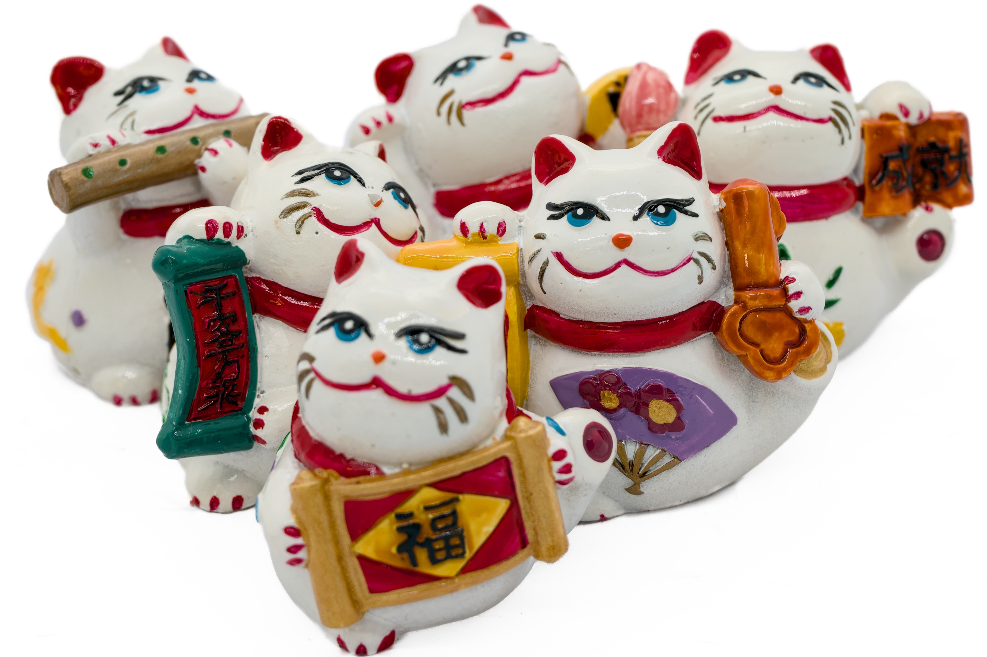 Das Set besteht aus 6 einzigartigen Figuren, jede mit einem anderen japanischen/chinesischen Zeichen und Accessoire. Jede Katze symbolisiert einen anderen Wunsch oder Segen wie Frieden, Glück, Wohlstand und Erfolg. Die weißen Keramikfiguren sind mit blauen Augen, roten Halsbändern und bunten handbemalten Details wie Blumen und Punkten verziert.
