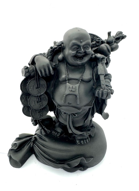 Die detailreiche Figur zeigt den Buddha mit einem Sack voller Schätze und Münzen – traditionelle Zeichen für Reichtum und finanzielles Glück. Sein fröhlicher Ausdruck und sein runder Bauch stehen für Fülle, Großzügigkeit und Lebensfreude.
