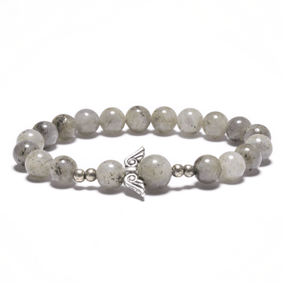 19-teiliges Armband aus 8-mm-Perlen und Edelsteinen mit silbernen Engeln.