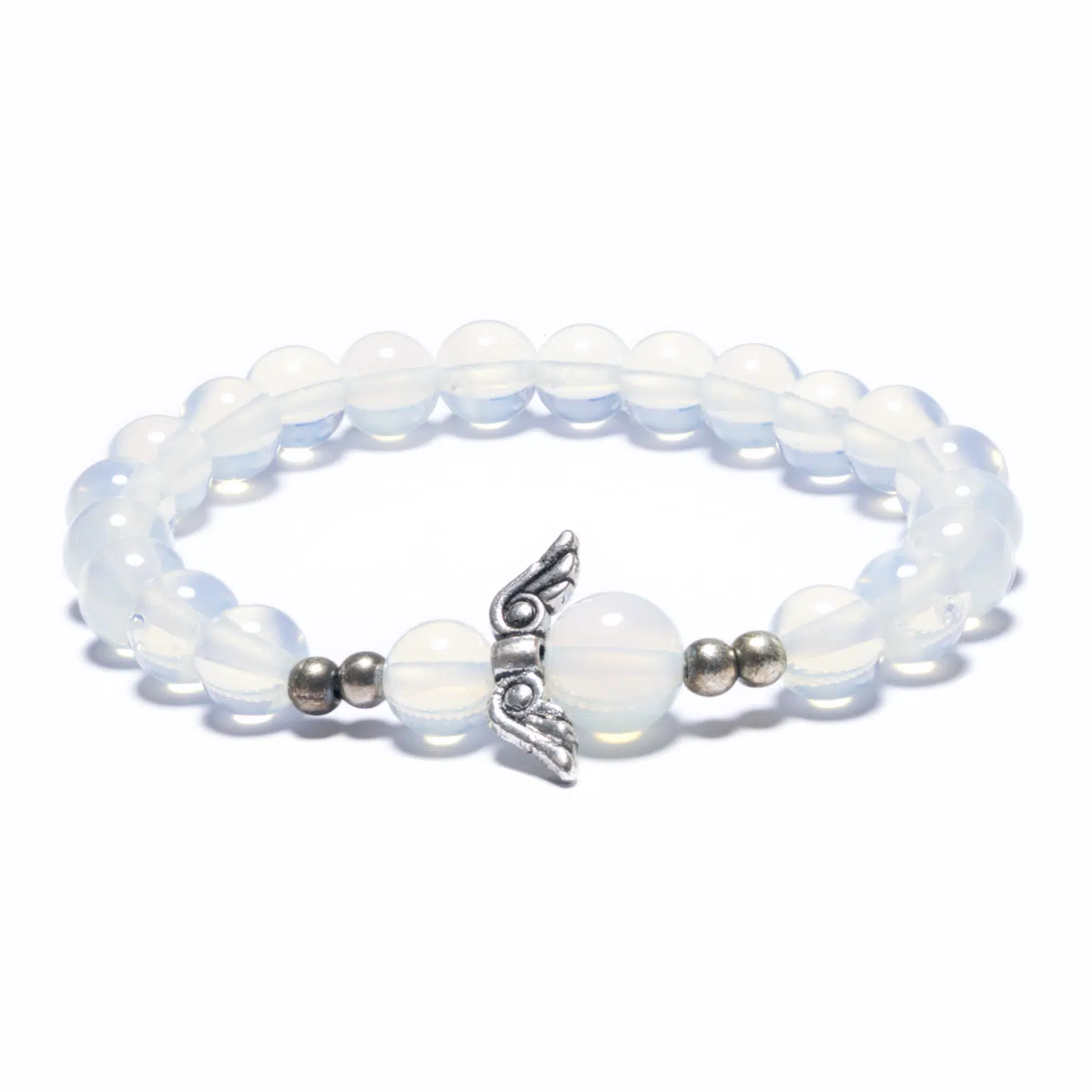 19-teiliges Armband aus 8-mm-Perlen und Edelsteinen mit silbernen Engeln.
