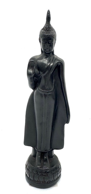 Diese wunderschöne thailändische Montag-Buddha-Statue zeigt die traditionelle Pang-Ham-Yati-Haltung, auch bekannt als die Haltung des Befriedens der Verwandten. In der thailändisch-buddhistischen Tradition symbolisiert dieser stehende Buddha Frieden, emotionale Ausgeglichenheit und die Kraft der Versöhnung.