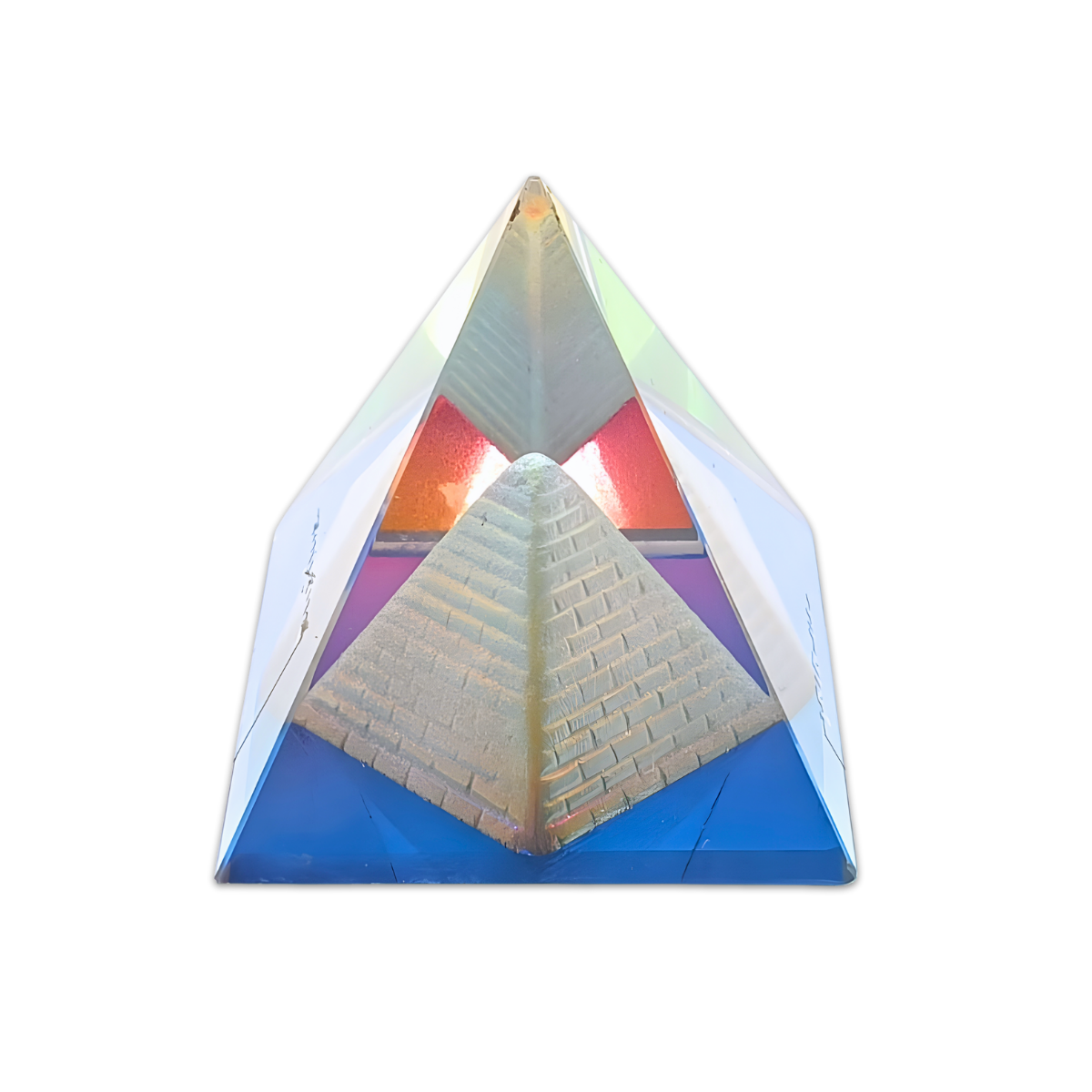 Kleine Kristallglaspyramide mit einer zweiten, ziegelstrukturierten Pyramide im Inneren und einer farbigen Prismabeschichtung. Die mehrfarbige Oberfläche sorgt für Regenbogeneffekte und räumliche Tiefe, wenn Licht hindurchscheint, und macht das Stück zu einem Blickfang auf Schreibtischen, Regalen oder Präsentationssockeln. Geeignet als dekoratives Element, für ägyptisch inspirierte Themen oder in Kombination mit einer LED-Lichtbasis, um die innere Pyramide und die Farbeffekte zu verstärken.