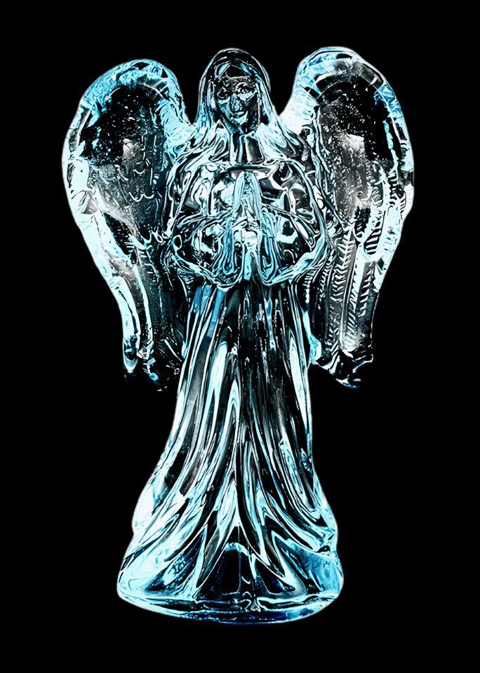 Stehende betende Engel-Figur mit gefalteten Händen, detaillierten Flügeln und fließendem Gewand aus Kristallglas mit sanftem Blauton.