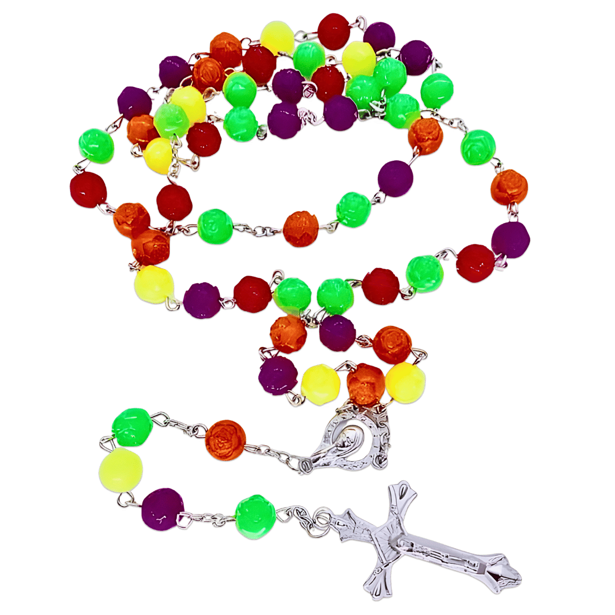 Rosenkränze sind momentan sehr beliebt. Ein Rosenkranz besteht aus einer Kette mit runden Perlen und einem stählernen Kreuz.