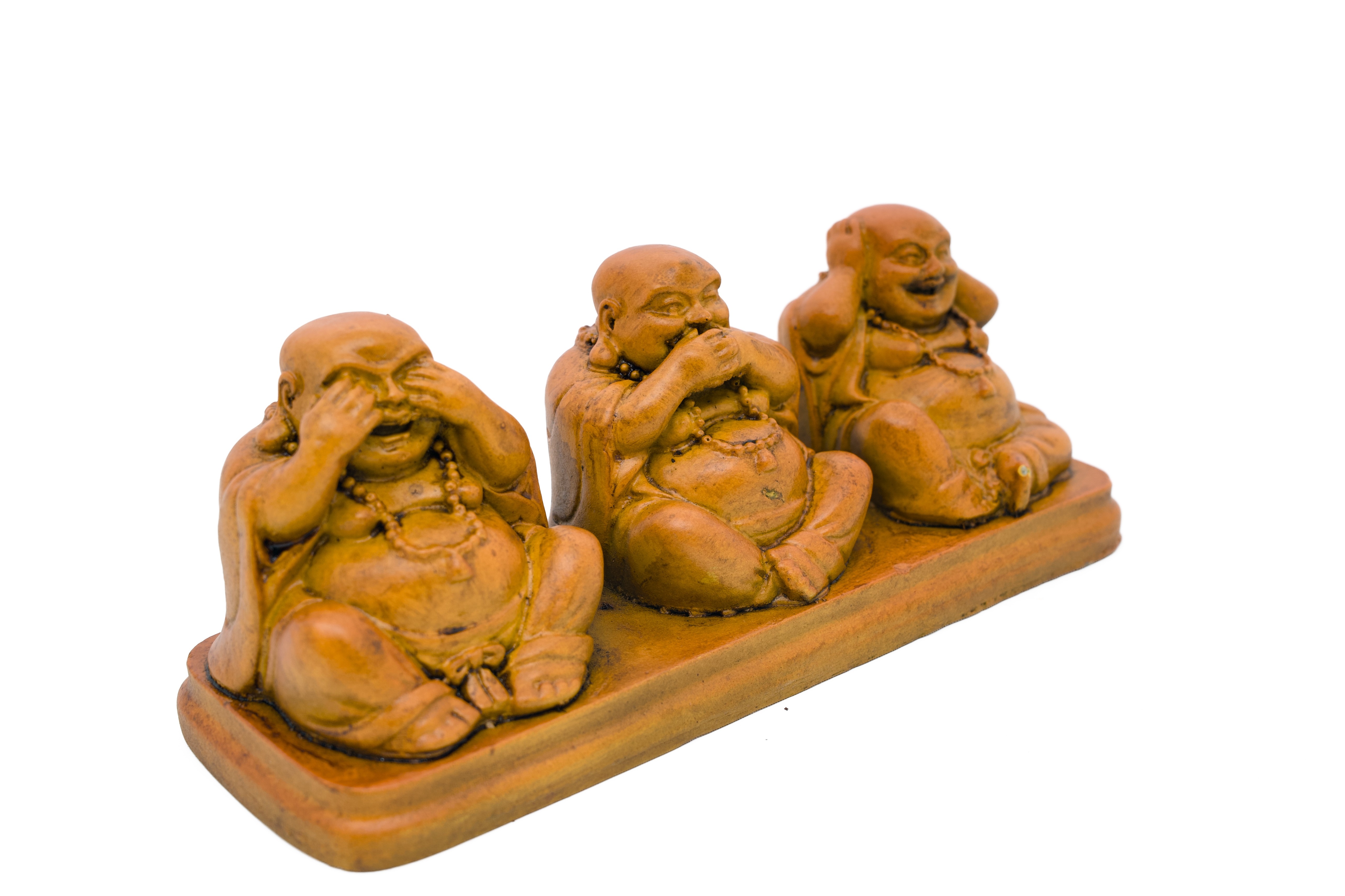 Drei fröhliche Budai (布袋) Figuren sitzen nebeneinander auf einem einzigen gemeinsamen rechteckigen Sockel, jeder in einer der klassischen „Nichts Böses hören, Nichts Böses sehen, Nichts Böses sprechen” Posen — Hände vor Ohren, Augen bzw. Mund. Schlicht, kühn und voller Charakter — dieses vereinte Trio macht in jedem Raum eine kraftvolle und fröhliche Aussage.