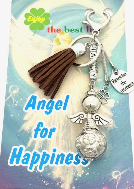 Grohandel – Dunkelbraun “HAPPY” Angel Schlüsselanhänger mit Quaste, Kleeblatt und Lebensbaum Anhänger