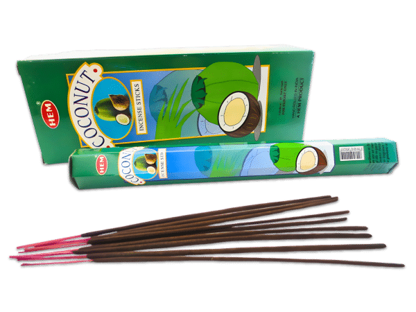 HEM Coconut Hexa Räucherstäbchen verströmen einen weichen, tropischen Duft mit cremigen, süßen Kokosnoten. Sie werden häufig eingesetzt, um eine entspannte, urlaubsähnliche Atmosphäre in Wohnräumen, Schlafzimmern, Wellnessbereichen und Boutiquen zu schaffen.