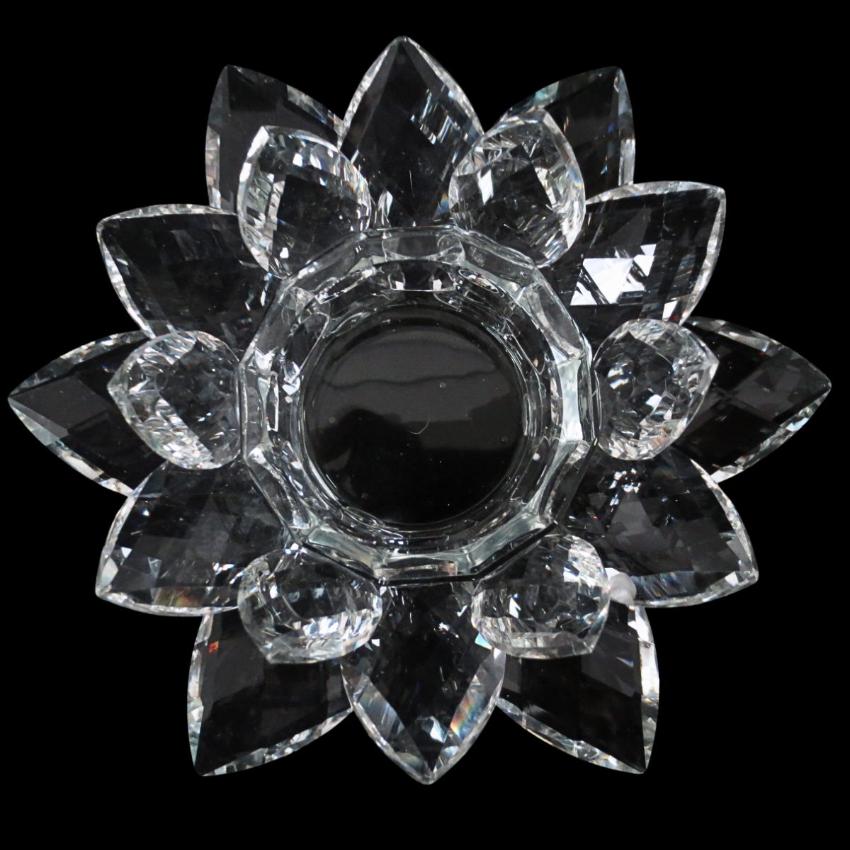 Große Lotusblüte aus klarem Kristallglas mit mehreren geschliffenen Blütenblättern und einer runden Vertiefung in der Mitte für ein Teelicht. Die facettierten Flächen brechen das Kerzenlicht und erzeugen einen ruhigen, funkelnden Effekt – ideal für Meditationsbereiche, Altäre, Spa-Räume sowie Schaufenster- oder Tischdekorationen.
