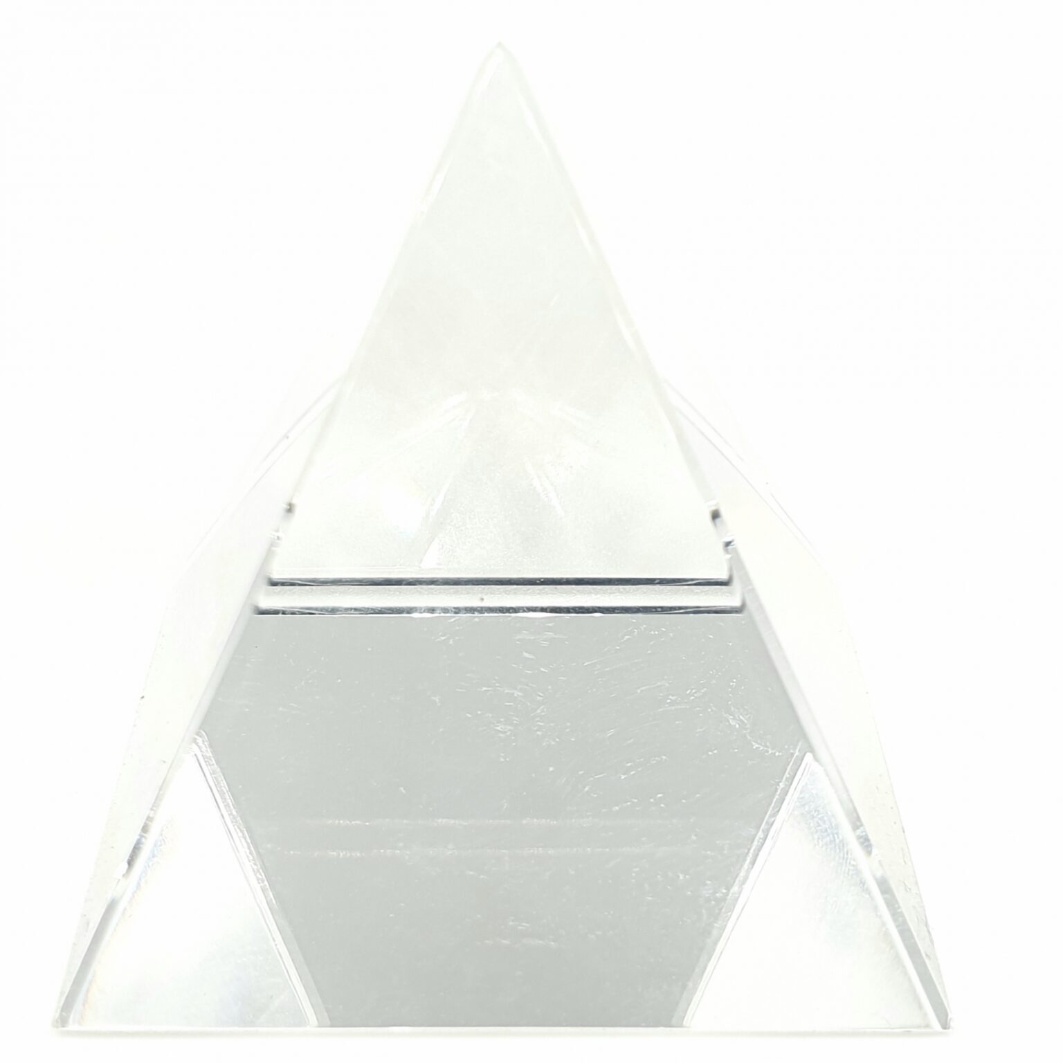 Größere Kristallglaspyramide mit ausgeprägten Facetten und spürbarem Gewicht. Der klar-weiße Körper und spiegelähnliche Innenflächen nehmen Umgebungslicht und Reflexionen auf und verleihen ein ruhiges, geometrisches Erscheinungsbild auf Regalen, Sideboards oder in Vitrinen. Häufig eingesetzt als markanter Kristall, für Meditationsbereiche oder als Blickfang auf einer Lichtbasis.