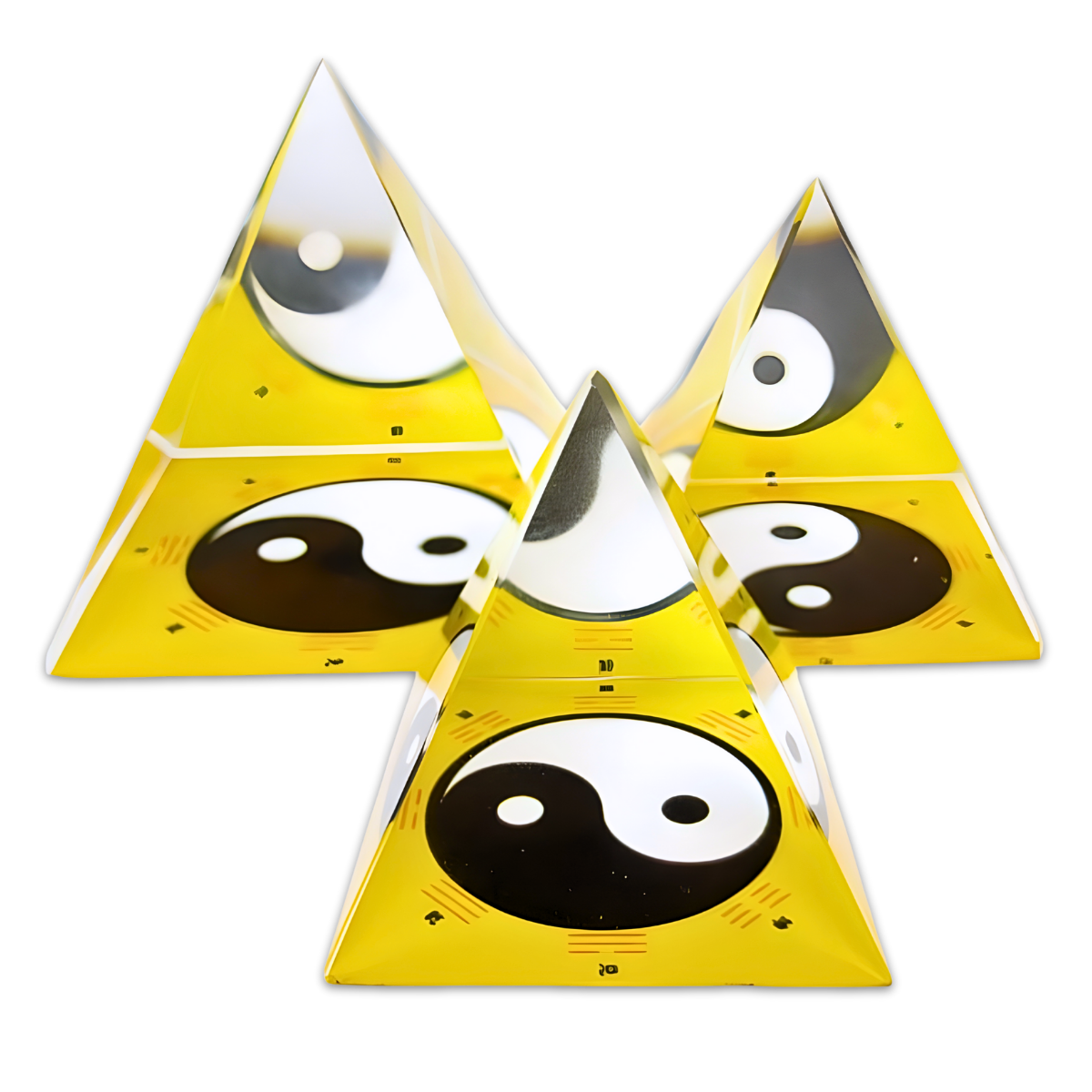Große, gelbe Yin-Yang-Kristallglaspyramide mit ausgeprägten Facetten und spürbarem Gewicht. Die leuchtend gelbe Basis und das gespiegelte schwarz-weiße Yin-Yang-Motiv erzeugen starke Reflexionen und einen markanten grafischen Eindruck – ideal als Blickfang auf Regalen, in Vitrinen oder in Feng-Shui-inspirierter Dekoration.