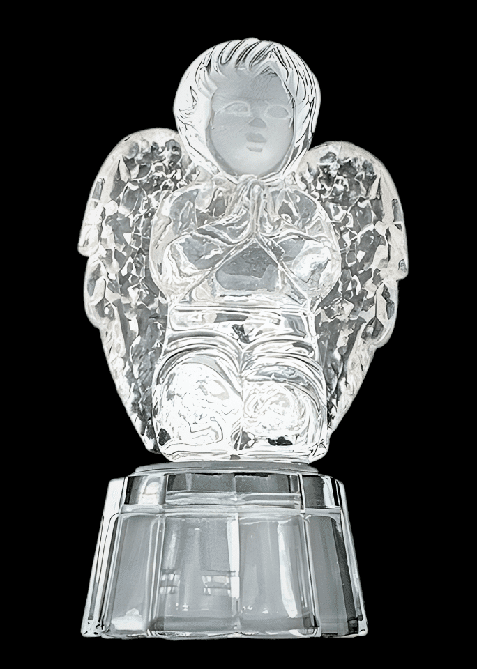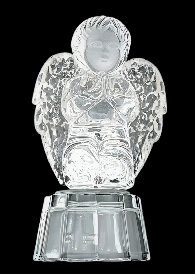 Kleine Engelsfigur aus Kristallglas mit gefalteten Händen, kindlichem Gesicht und strukturierten Flügeln auf einem facettierten Sockel. Die Kombination aus klarem und mattiertem Glas erzeugt einen weichen, dekorativen Eindruck und eignet sich als Schutzengel oder Geschenkartikel.
