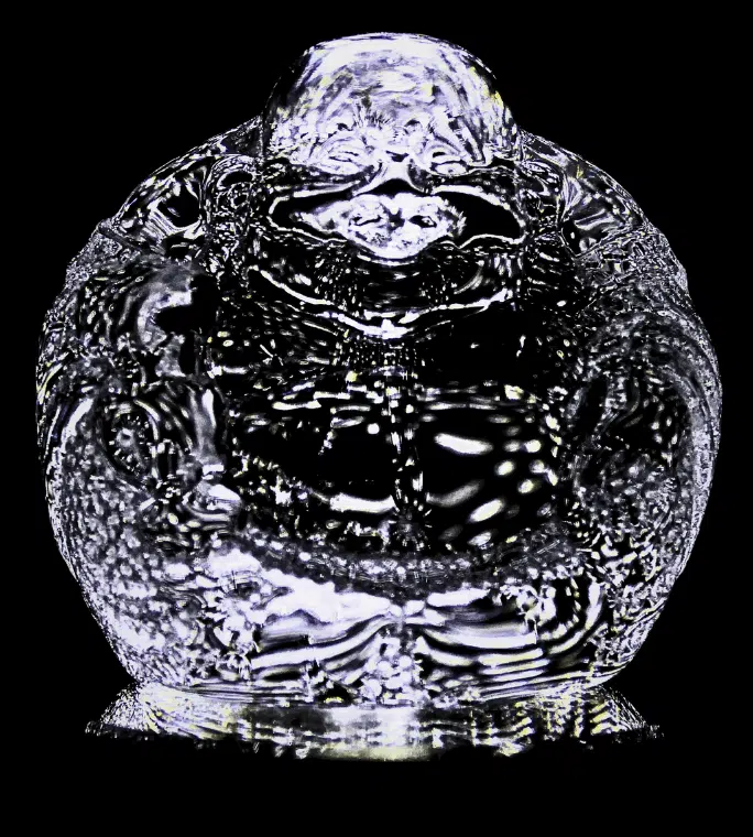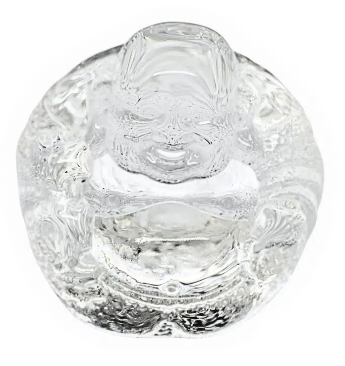 Kompakte, abgerundete chinesische Happy-Buddha-Figur aus klarem Kristallglas mit fein ausgearbeitetem Gesicht, Gewand und Bauch in einem massiven Block.