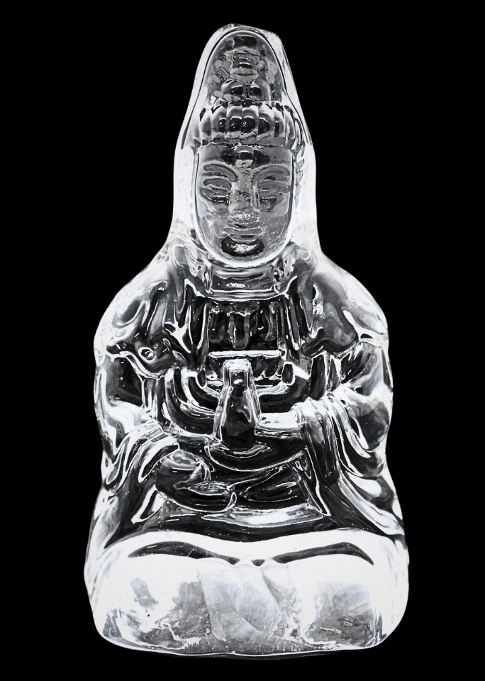 Kompakte sitzende Kwan-Yin-Figur aus klarem Kristallglas mit detailliertem Gewand und Kopfschmuck, die Hände vorne gefaltet – im Stil der buddhistischen Bodhisattva des Mitgefühls (Guanyin / Kuan Yin).