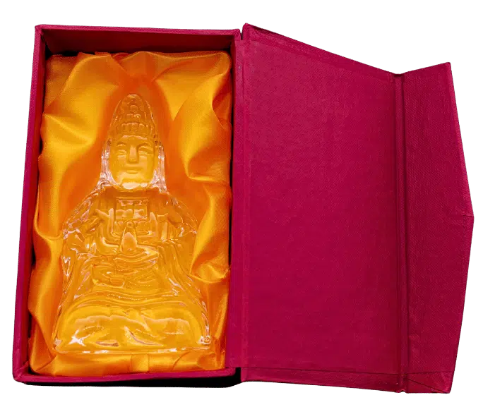 Sitzende Kwan-Yin-Figur aus klarem Kristallglas mit detailliertem Gewand und Kopfschmuck, die Hände im Schoß mit einem kleinen Gefäß, im Stil der buddhistischen Bodhisattva des Mitgefühls (Guanyin / Kuan Yin).