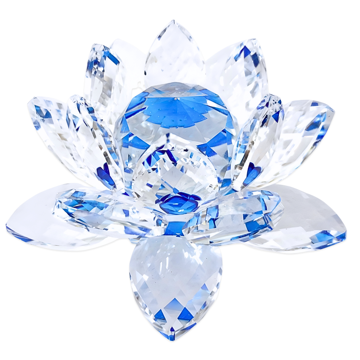 Kompakte, facettierte Kristallglas-Lotusblüte mit mehreren Schichten klarer Blütenblätter und dezenten saphirblauen Akzenten. Der erhöhte Mittelstein und die Schliffe der Blätter fangen das Licht ein und erzeugen sanfte Reflexe – ein dezenter Blickfang für Regale, Fensterbänke oder Kristallpräsentationen. In der Feng-Shui-Dekoration steht die Kristall-Lotusblüte für Reinheit, Ausgleich und harmonische Energie, während Blautöne mit Ruhe und klarer Kommunikation verbunden werden.