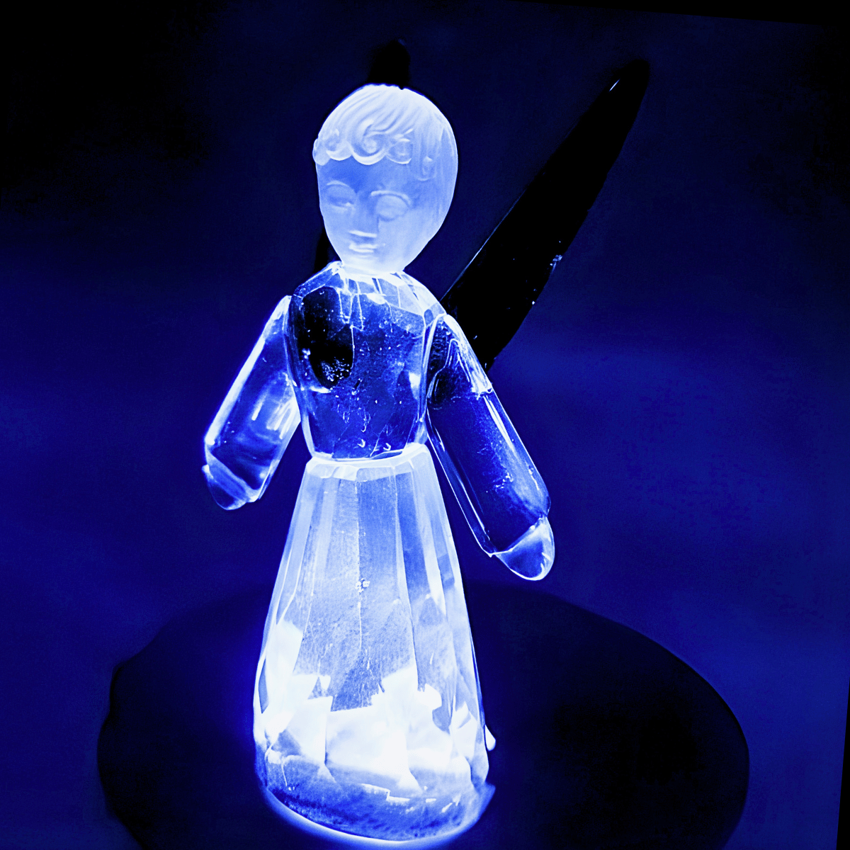 Kleine stehende Engel-Figur aus klarem grün getöntem Kristallglas. Mit glatten Gesichtszügen, facettiertem Gewand und schlichten Flügeln hinter dem Körper. Die grüne Farbe wirkt ruhig und natürlich – passend für Dekoration und spirituelle Geschenkserien.