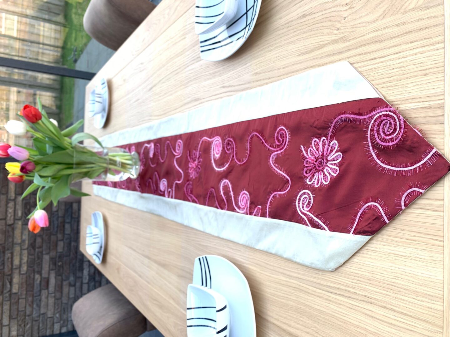 Eleganter bestickter Tischläufer – Burgunderrot und silberfarbener dekorativer Tischläufer