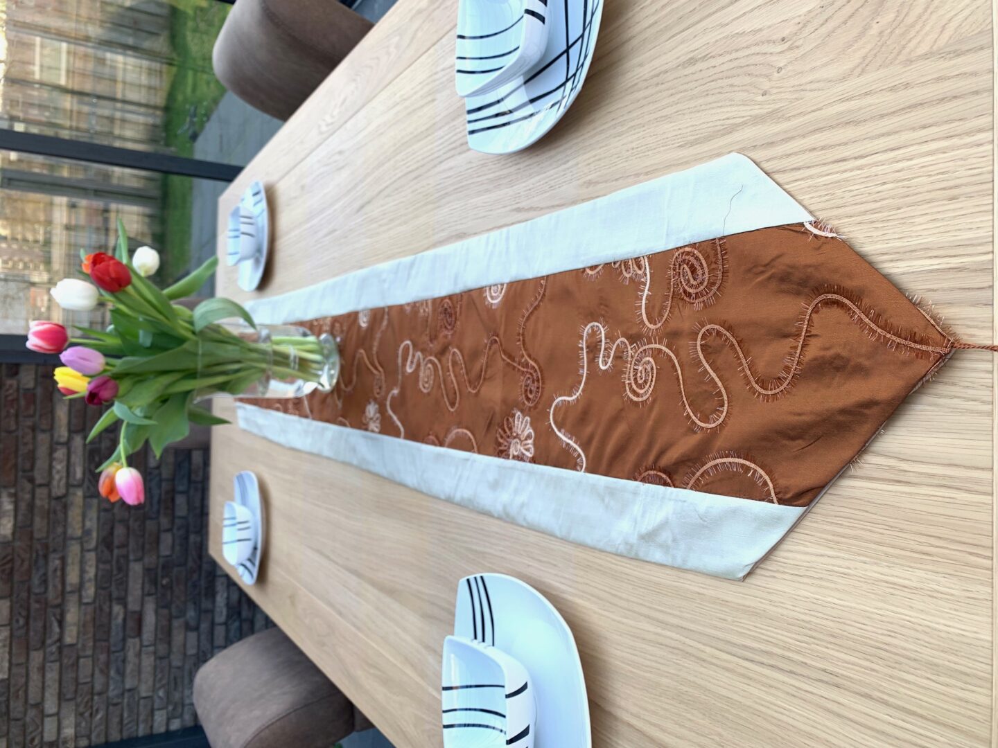 Dieser kunstvoll gefertigte bestickte Tischläufer bringt Eleganz und Wärme in Ihren Essbereich. Mit einem satten braunen Mittelteil und zarten Stickmustern, eingefasst von cremefarbenen Rändern, verleiht er jedem Tischarrangement eine edle Note. Ideal für den täglichen Gebrauch oder besondere Anlässe schützt dieser Tischläufer Ihre Tischplatte und verschönert gleichzeitig Ihre Einrichtung. Perfekt für Esstische, Couchtische oder Konsolentische – er passt sowohl zu modernen als auch zu traditionellen Interieurs. Kombinieren Sie ihn mit frischen Blumen oder Kerzen für ein einladendes, stilvolles Ambiente, das Gäste beeindruckt und Ihre Wohnatmosphäre mühelos aufwertet.