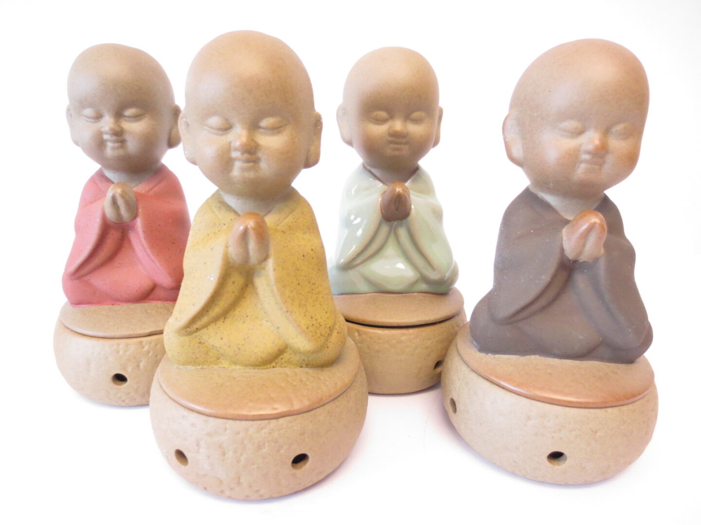 Schöner Weihrauch / Kegelbrenner mit vier Mönchen in verschiedenen Farben. Unter dem Mönch gibt es Raum eine Kegelspitze zu verbrennen. Der Rauch des Konus wird von dem Kopf des Mönchs freigesetzt, wo Löcher sind Der Weihrauch / Kegelbrenner ist aus Feinkeramik hergestellt.Der Preis ist pro Satz von 4