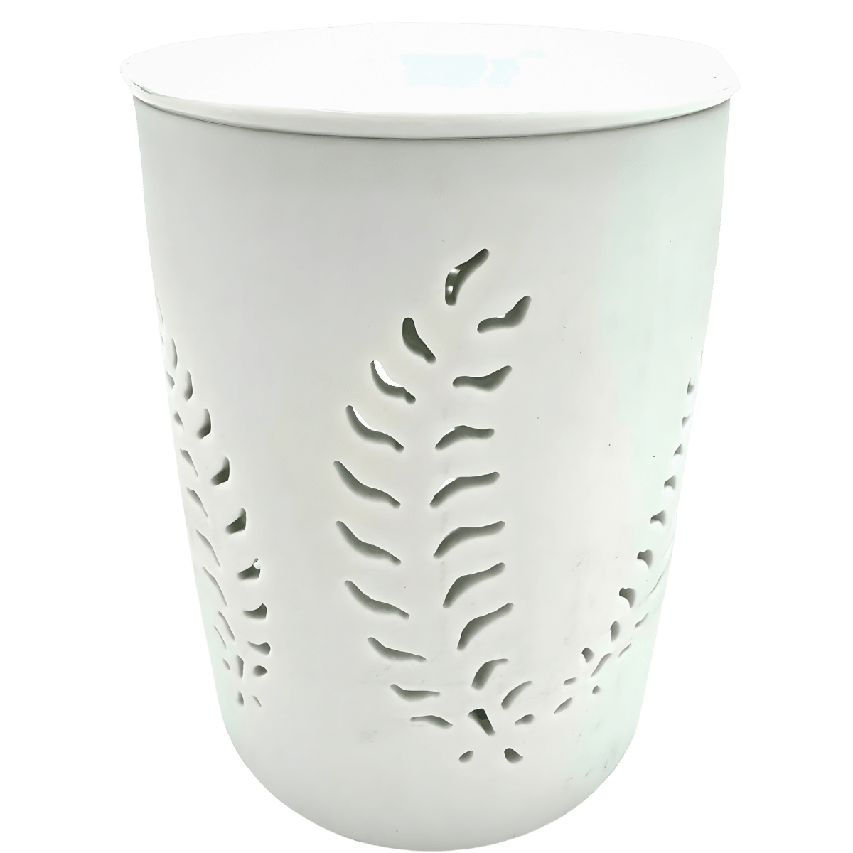 Weißer Keramik-Ölbrenner in hoher Zylinderform mit länglichen Federmotiven als Ausstanzungen rundum. Hinten befindet sich eine Öffnung zum Einsetzen des Teelichts, während die feste Schale oben für Duftöl, ätherische Ölmischungen oder Duftwachs vorgesehen ist. Beim Brennen erscheinen die Federmotive als schmale Lichtstreifen und eignen sich für Wohnräume, Läden oder Behandlungsräume als dezenter Duft- und Lichtträger.