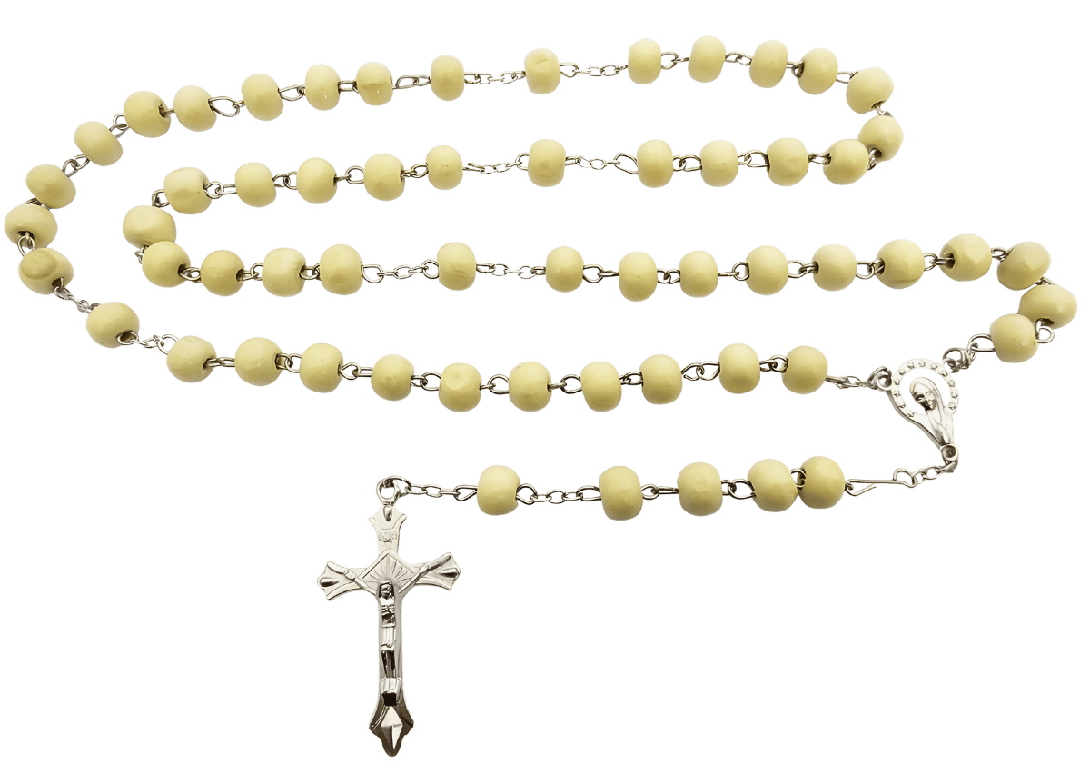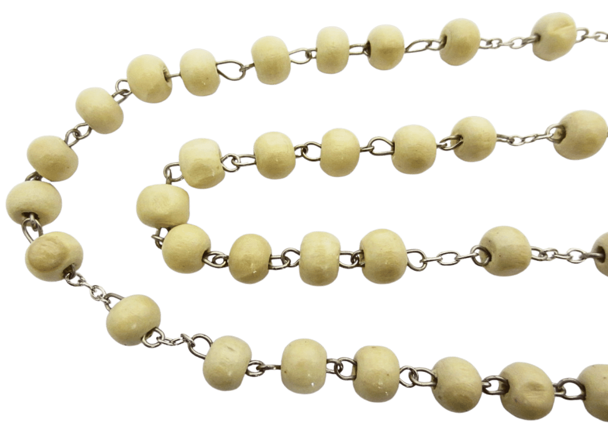 Dieser Rosenkranz hat eine stählerne Kette und ein Kreuz mit runden beigen Perlen.