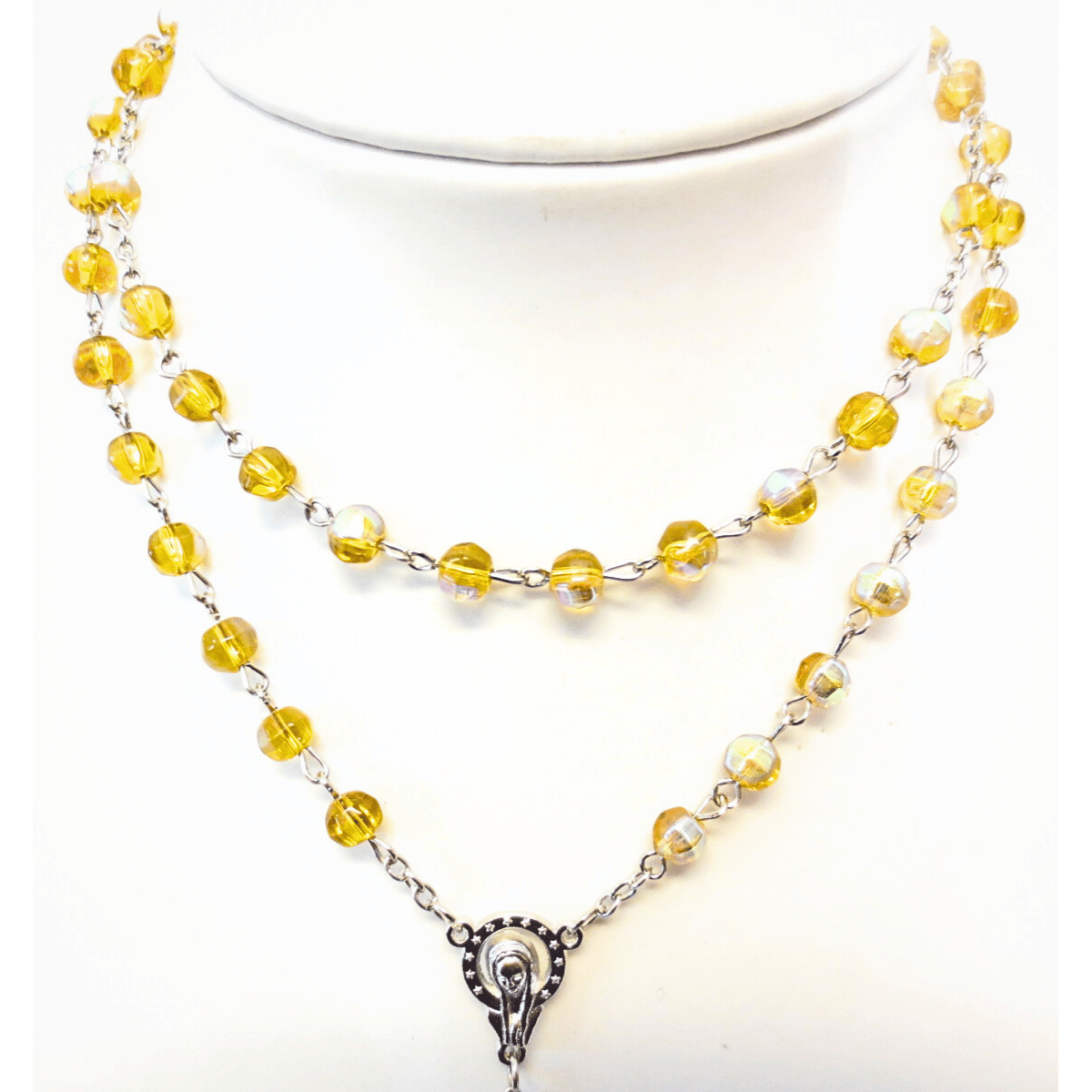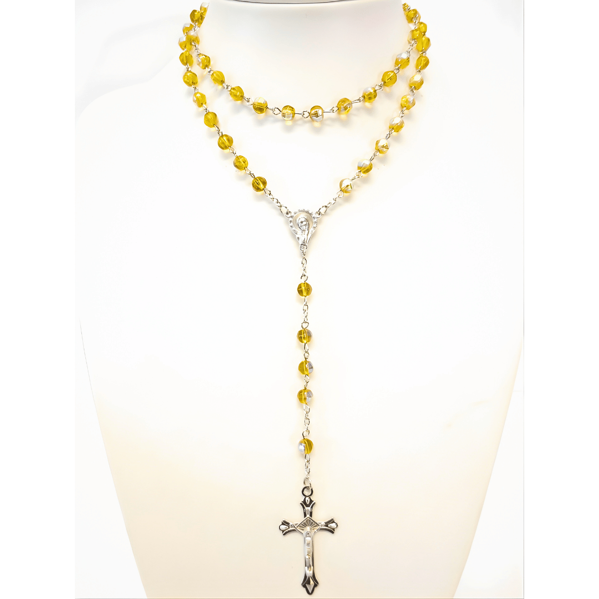 Rosenkränze sind momentan sehr beliebt. Ein Rosenkranz besteht aus einer Kette mit runden Perlen und einem stählernen Kreuz. Diese Kette hat gelbe runde Perlen.