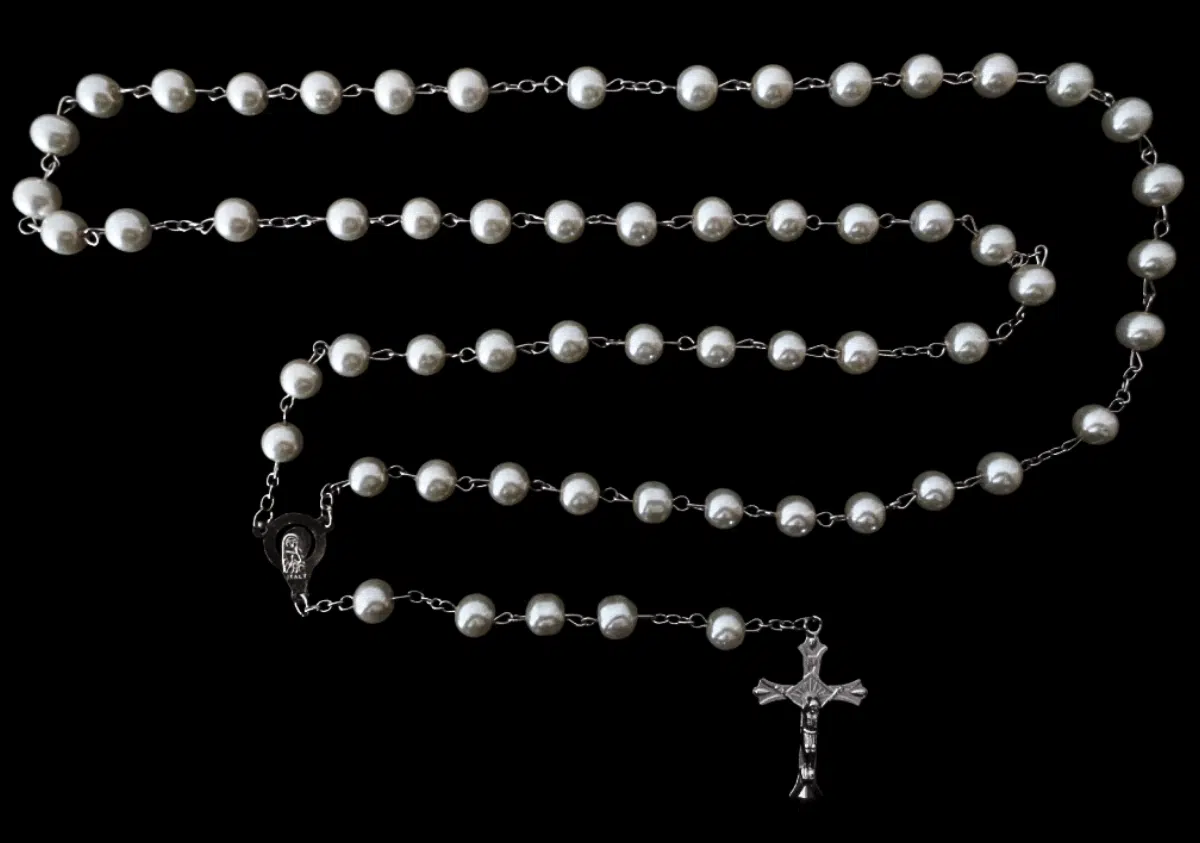 Rosenkränze sind momentan sehr beliebt. Ein Rosenkranz besteht aus einer Kette runder Perlen und einem Stahlkreuz