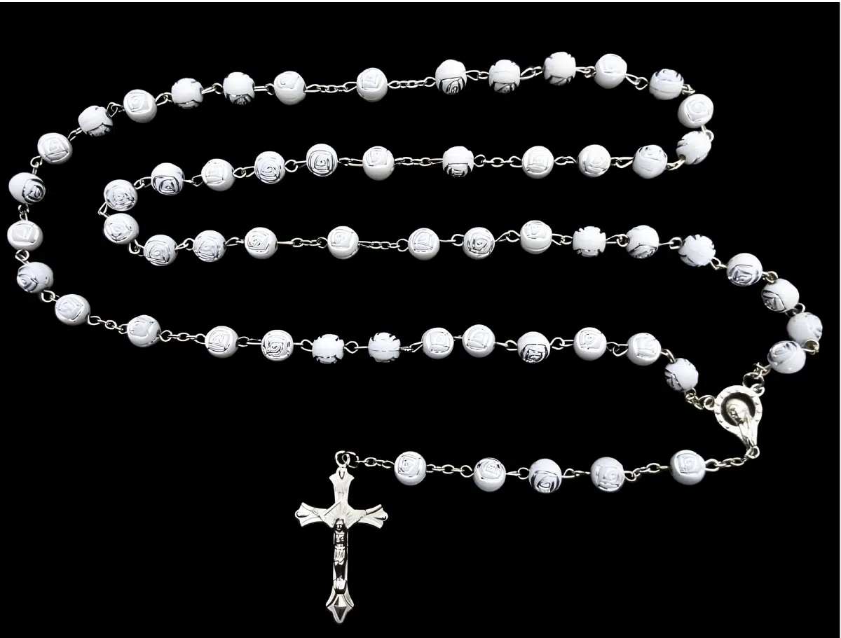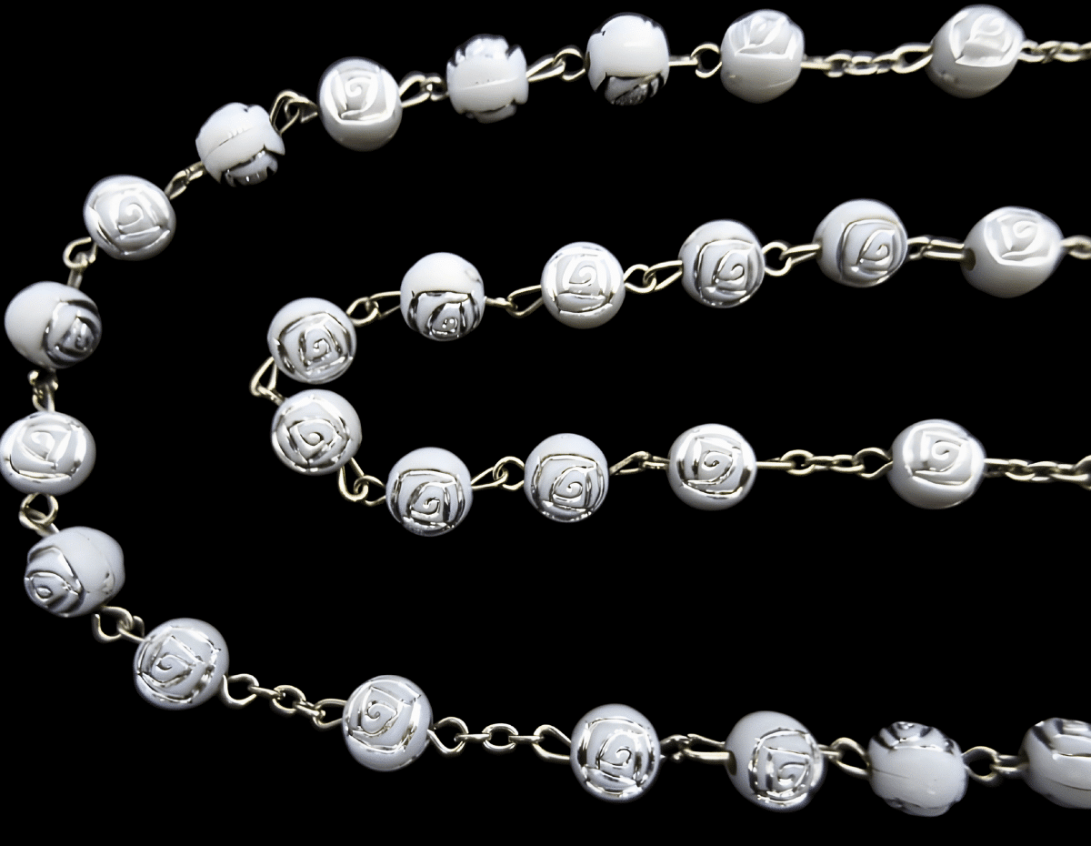 Rosenkränze sind momentan sehr beliebt. Ein Rosenkranz besteht aus einer Kette mit runden Perlen und einem stählernen Kreuz.