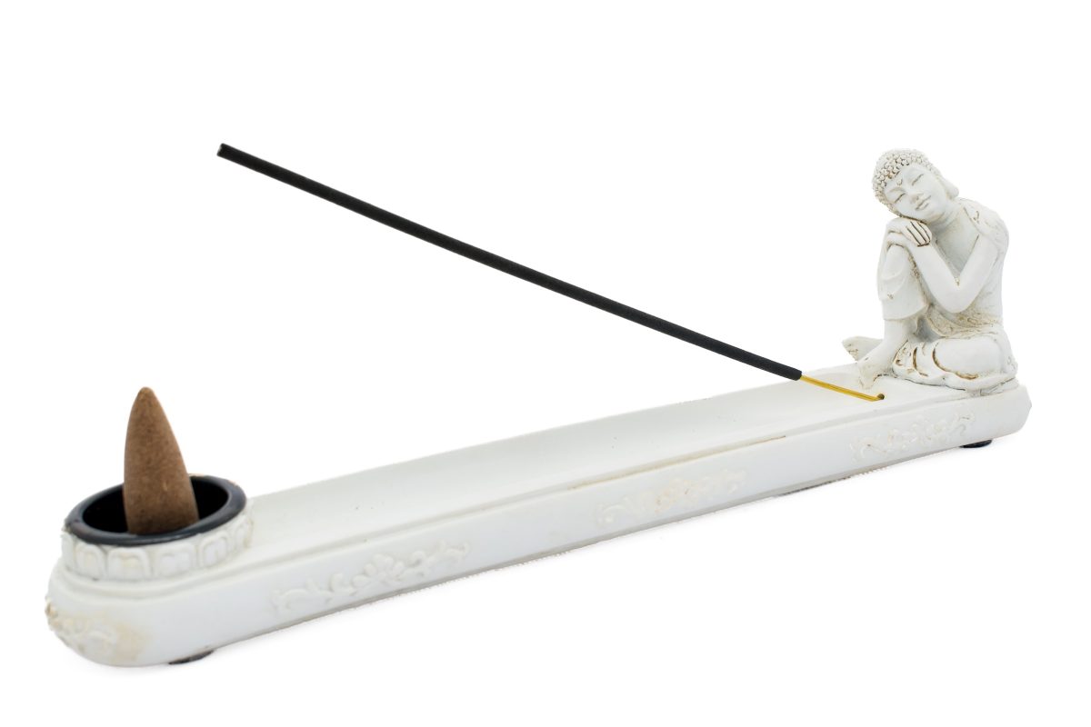 Großhandel – Weißer Ruhe-Buddha Räucherhalter für Stäbchen & Kegel