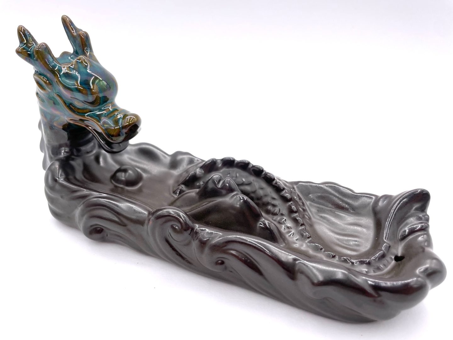 Dieser Drachen-Rückfluss-Räucherstäbchenhalter hat eine moosgrüne Farbe und besteht aus hochwertiger Keramik, verpackt in einer sicheren weißen Schutzverpackung. Dieser Räucherstäbchenhalter ist sowohl für Räucherstäbchen als auch für Rückflusskegel geeignet.