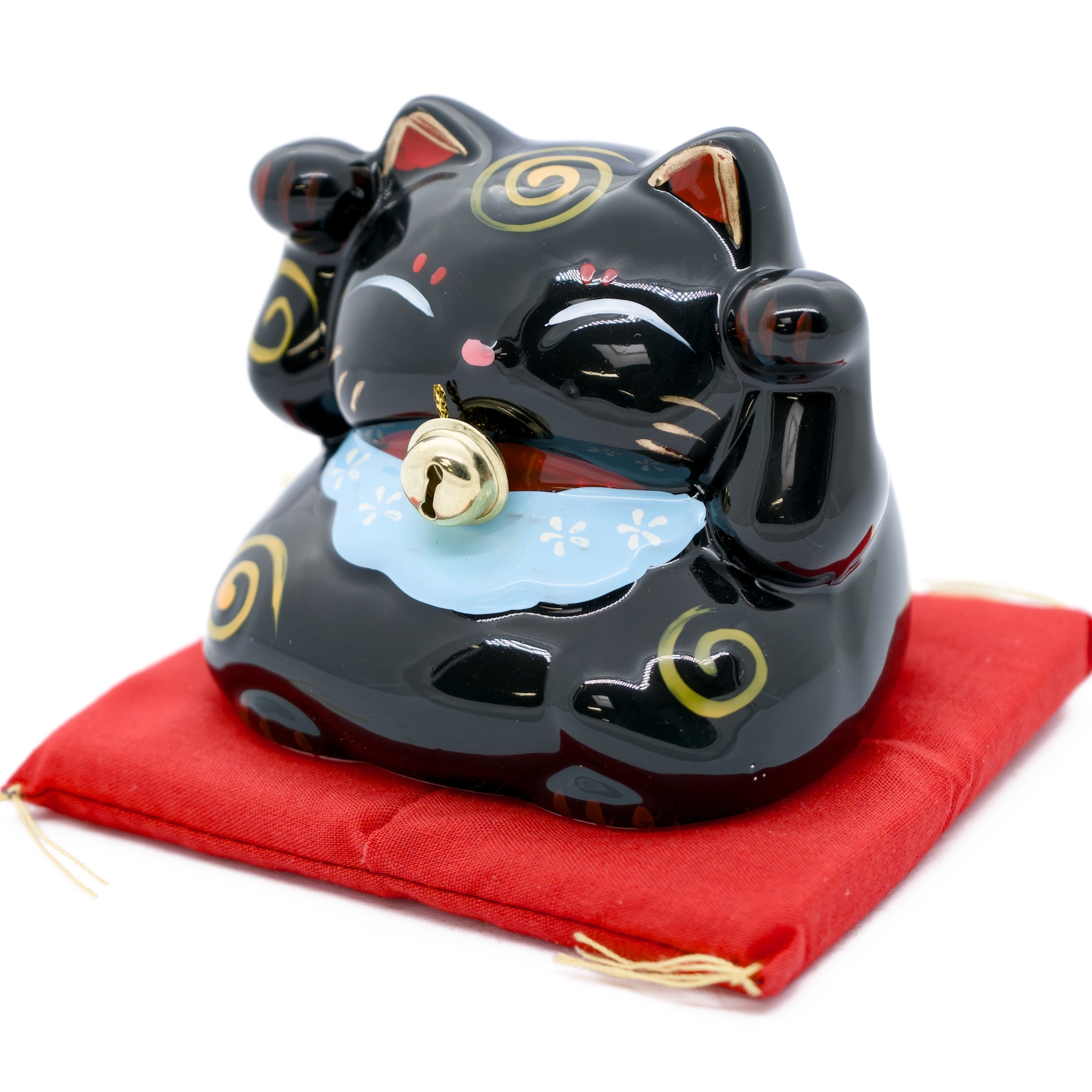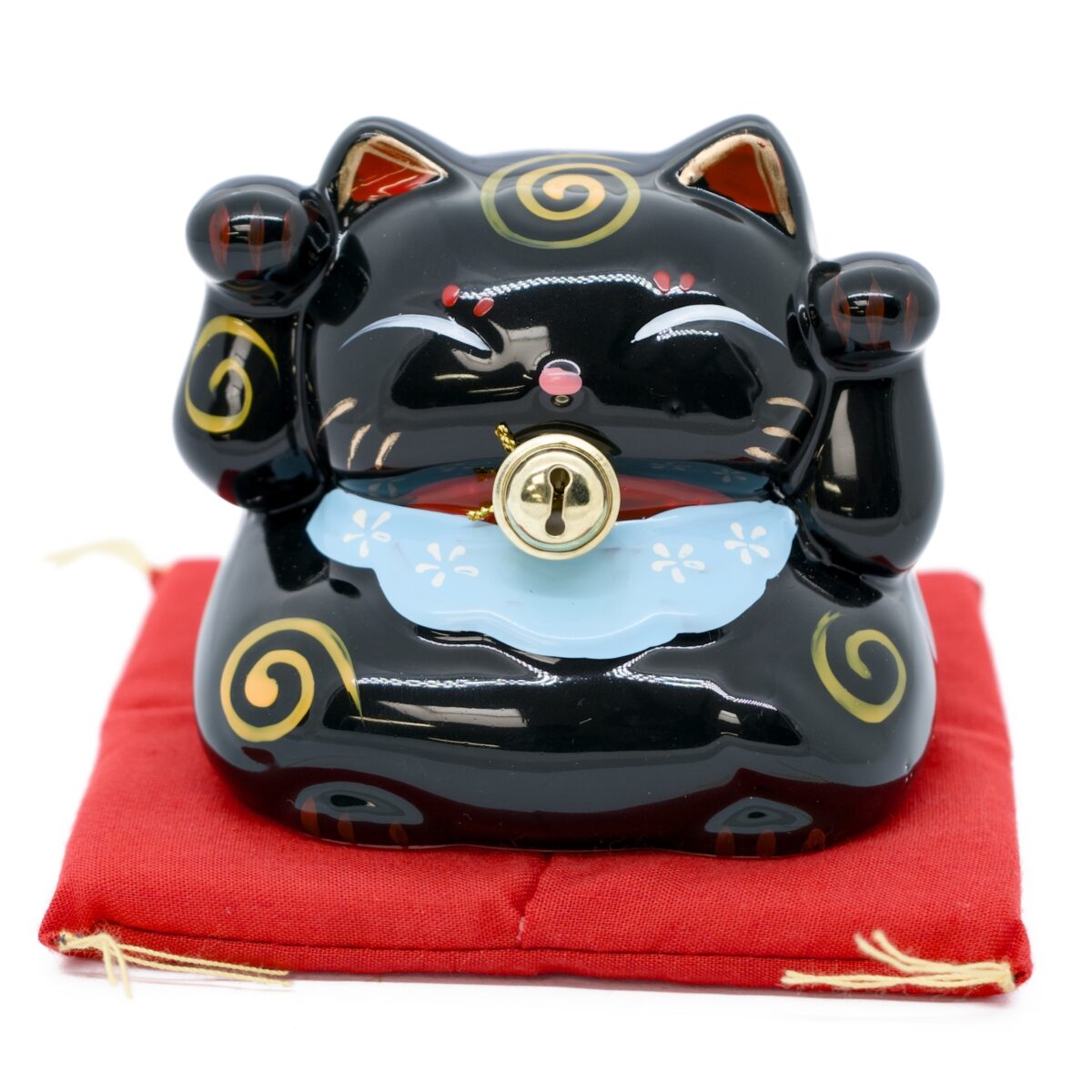 Diese charmante Katze hat beide Pfoten erhoben, was sowohl Schutz als auch Reichtum anzieht. Ein elegantes blaues Halsband mit weißen Blumenmotiven und eine große echte goldene Metallglocke schmücken ihren Hals. Der glänzend schwarze Körper ist mit goldenen Spiralmotiven und roten Details an den Pfoten verziert. Die Spardose wird auf einem roten Samtkissen mit goldenen Schnüren geliefert — fertig zum Verschenken.